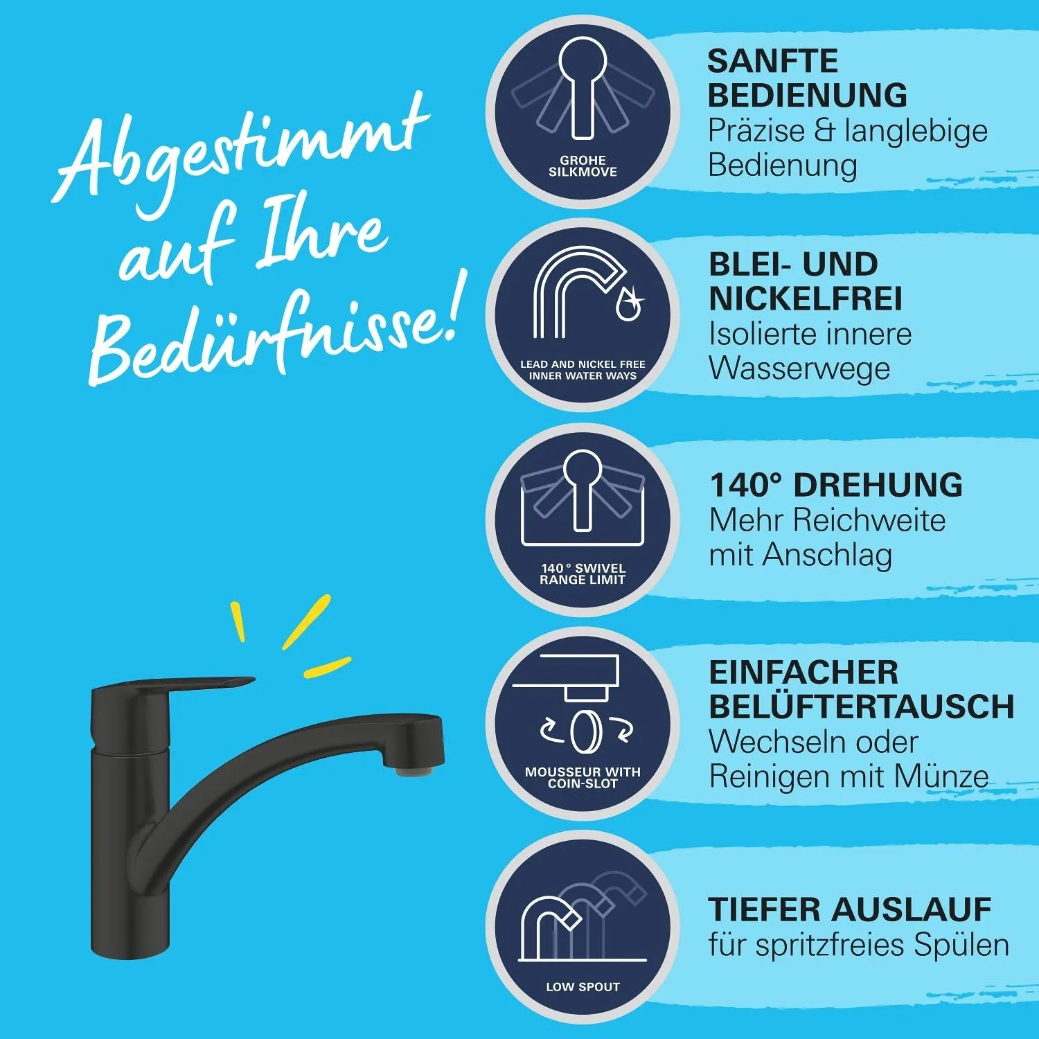 Elegancka i funkcjonalna bateria kuchenna GROHE Start w kolorze czarnym to połączenie nowoczesnego stylu i wygody użytkowania. Wyposażona w głowicę ceramiczną, precyzyjną dźwignię oraz wymienny perlator, zapewnia płynną regulację strumienia wody i komfort codziennego korzystania. Mosiężna konstrukcja gwarantuje trwałość, a wieloletnia gwarancja producenta zapewnia spokój na lata.