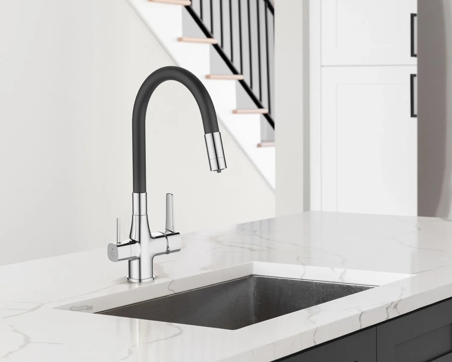 Bateria filtrująca wodę od firmy Invena to doskonałe rozwiązanie, które zapewnia dostęp do czystej i zdrowej wody bez konieczności używania dodatkowych butelek. Dzięki specjalnemu systemowi filtracji, bateria skutecznie eliminuje chlor, zanieczyszczenia mechaniczne oraz poprawia smak i zapach wody. W zestawie znajduje się filtr wody (wkład węglowy) wraz z kompletnym zestawem podłączeniowym, w tym dwa wężyki o długości 40 cm (3/8W x M10x1), co ułatwia montaż i zapewnia kompatybilność z systemem filtracyjnym. Bateria została wyposażona w powłokę PVD, która zapewnia odporność na zarysowania i utrzymuje estetyczny wygląd przez długi czas. Elastyczna wyewka gwarantuje wygodne użytkowanie, a filtracja wody zapewnia czystość i zdrowie. Bateria posiada 7-letnią gwarancję.