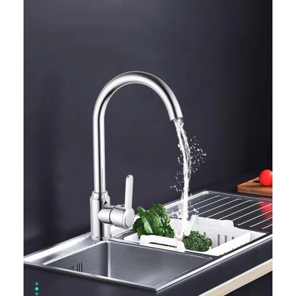 Stojąca bateria kuchenna wyposażona jest w perlator, który redukuje ilość zużywanej wody, przez co wpływa na zwiększenie oszczędności. Bateria oferuje przepływ wody na poziomie 15 l/min. W komplecie znajdują się dwa wężyki M10-3/8 o długości 35 cm. Korek nie wchodzi w skład zestawu.