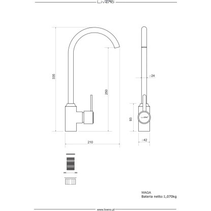 Stojąca bateria kuchenna wyposażona jest w perlator, który redukuje ilość zużywanej wody, przez co wpływa na zwiększenie oszczędności. Bateria oferuje przepływ wody na poziomie 15 l/min. W komplecie znajdują się dwa wężyki M10-3/8 o długości 35 cm. Korek nie wchodzi w skład zestawu.