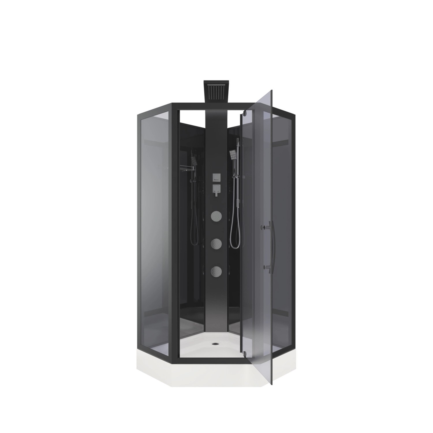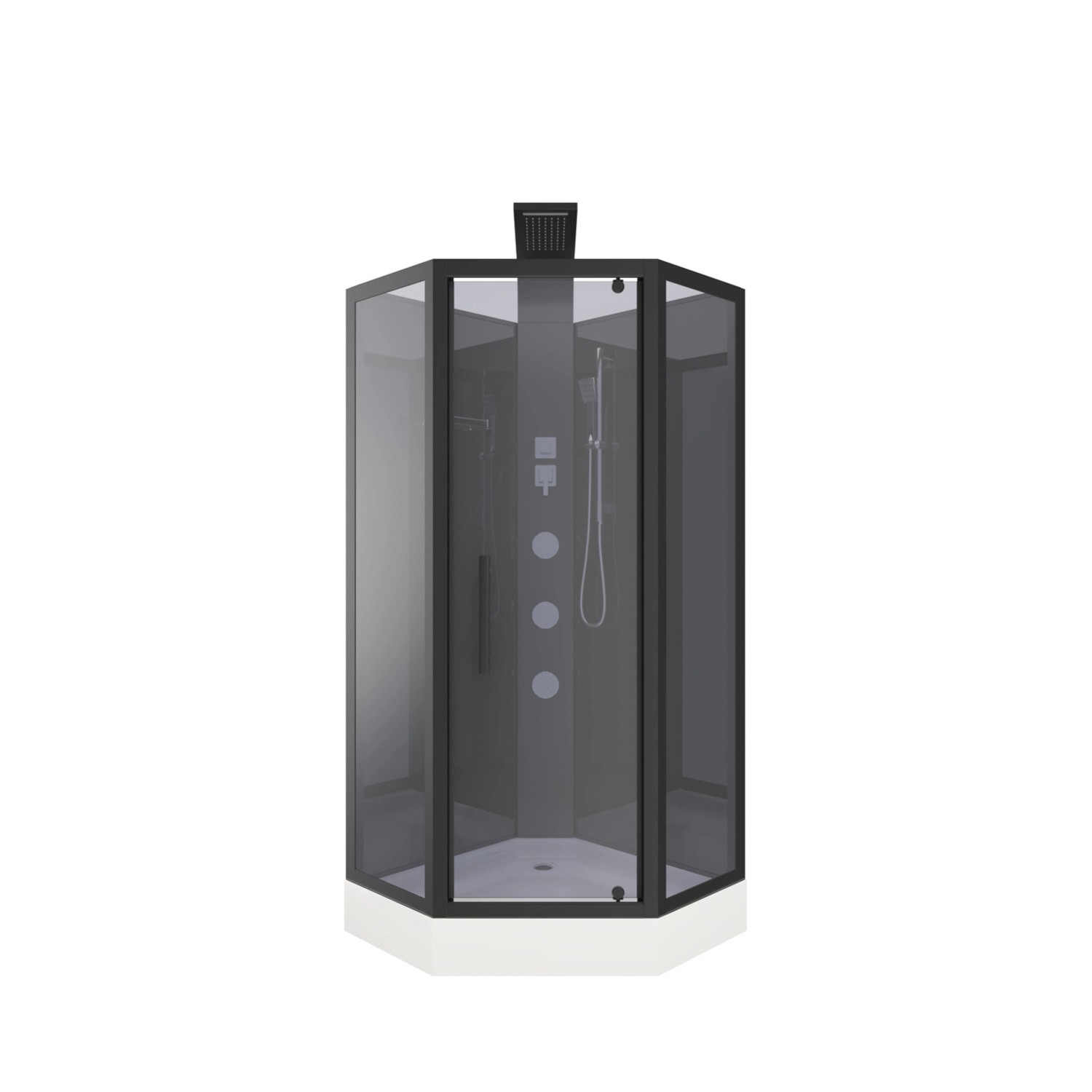 Dodatkowo kabina wyposażona została w 3 duże silikonowe dysze do hydromasażu, deszczownię, słuchawkę prysznicową.