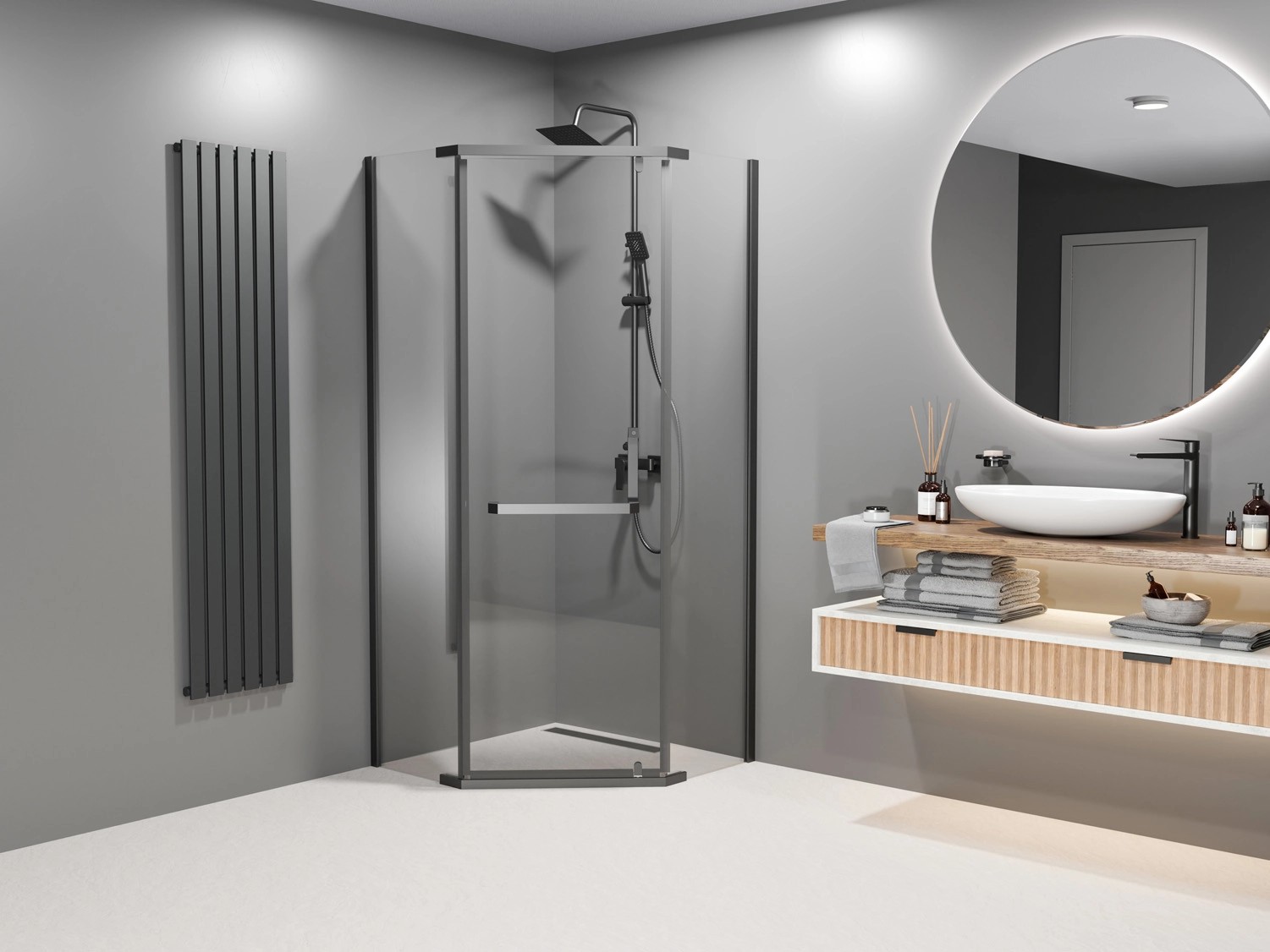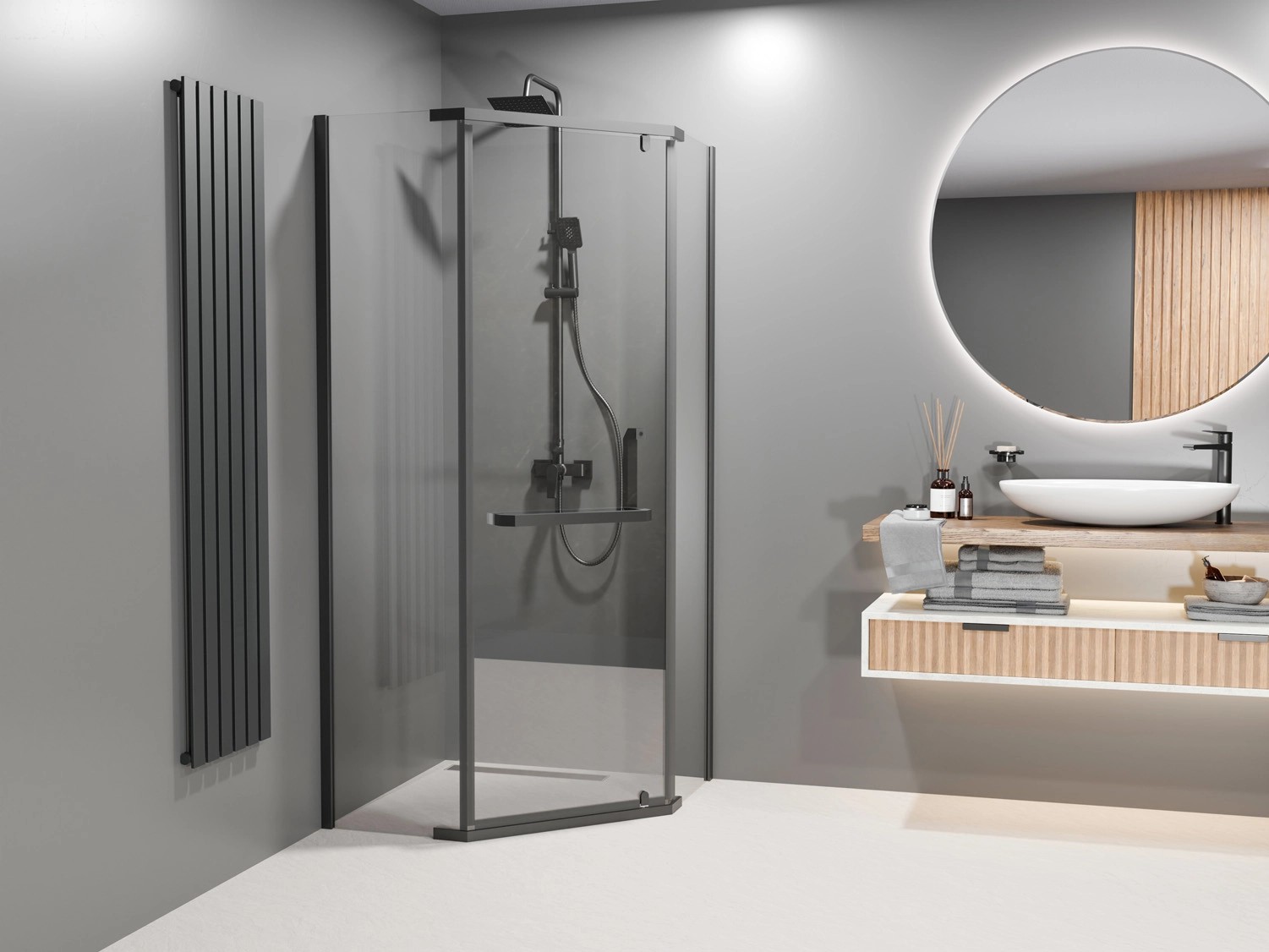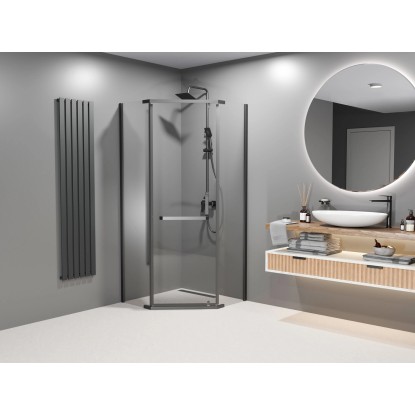 Elegancka kabina prysznicowa została wykonana z hartowanego transparentnego szkła, o grubości 8 mm. Kabina narożna z 5-ciokątną konstrukcją, która zapewnia oszczędność miejsca oraz wysoką funkcjonalność.