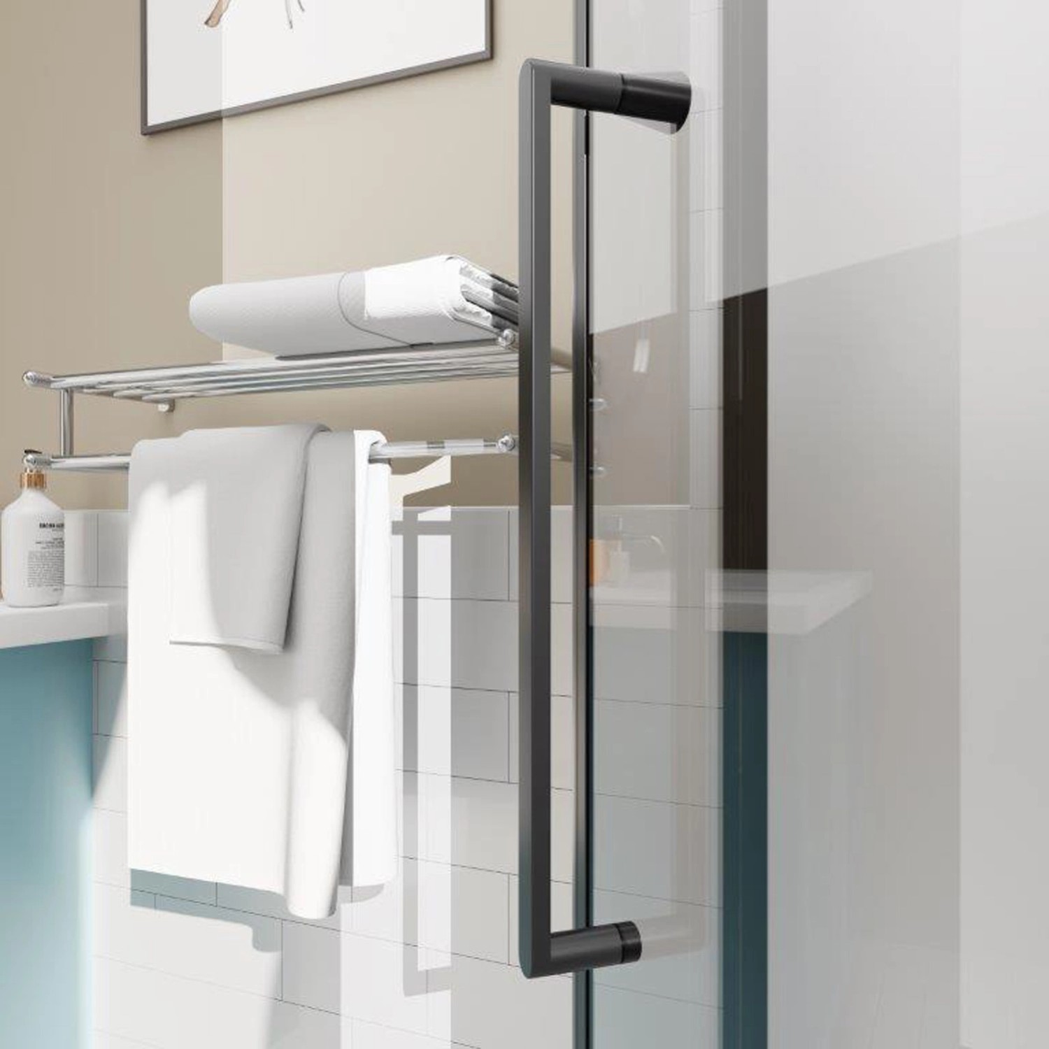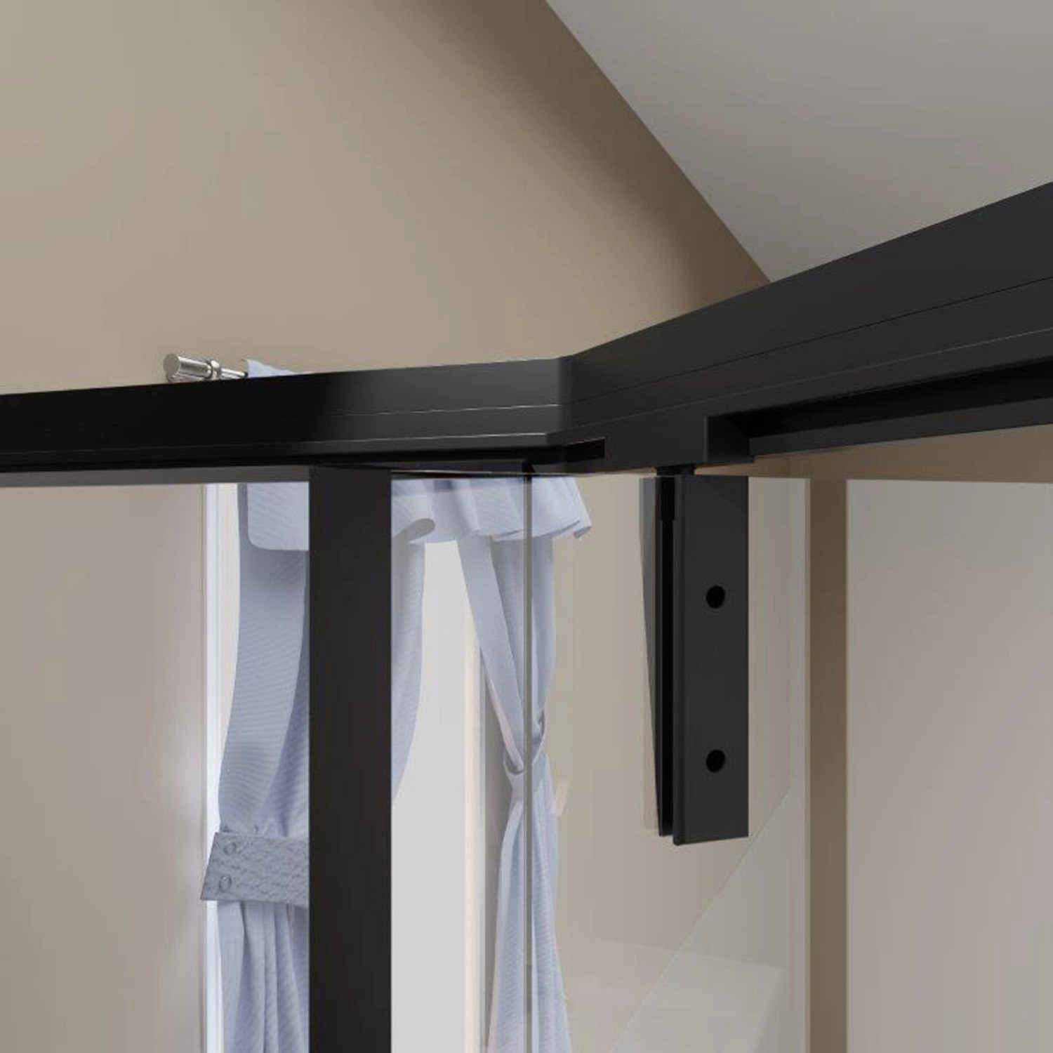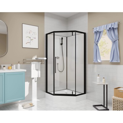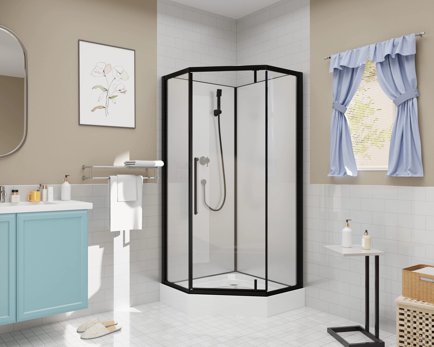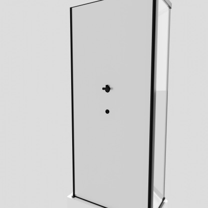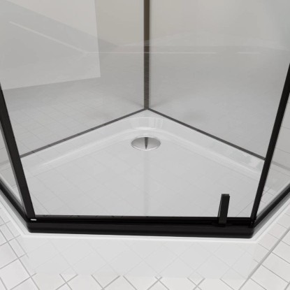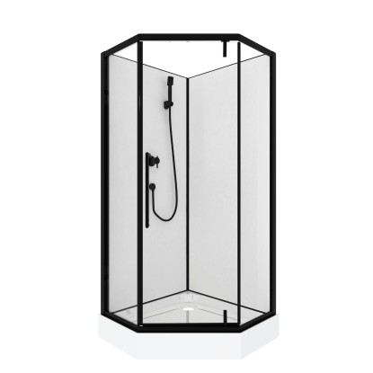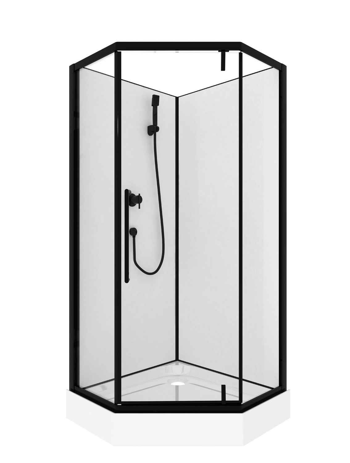 Została wykonana z hartowanego transparentnego szkła, o grubości 5 mm. Kabina narożna z 5-ciokątną konstrukcją, która zapewnia oszczędność miejsca oraz wysoką funkcjonalność. Wyposażona jest w drzwi 1-skrzydłowe uchylne, a geometryczne kształty i czarne elementy sprawiają, że kabina świetnie się prezentuję w połączeniu z każdym stylem. Wymiary całkowite: 90 x 90 x 200 cm.