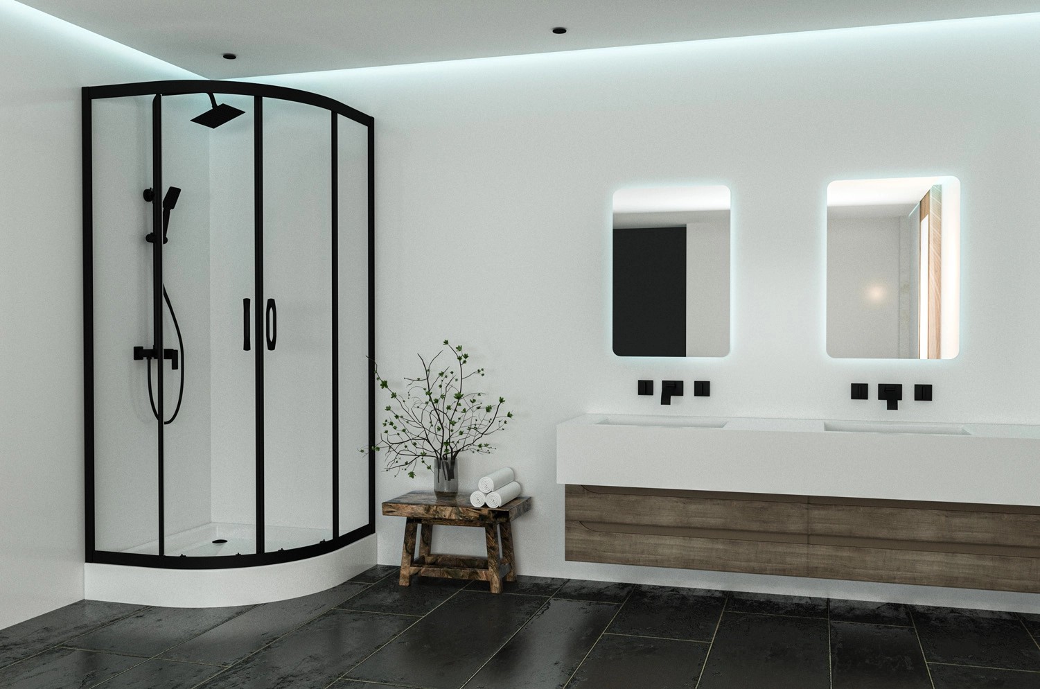 Kabiny wykonano z wytrzymałego szkła hartowanego o grubości 5 mm, a ich konstrukcja oparta jest na cienkich, eleganckich profilach, dostępnych w dwóch wersjach kolorystycznych: chrom oraz czarny mat. To uniwersalna kolorystyka, która dobrze współgra z większością łazienkowych aranżacji.