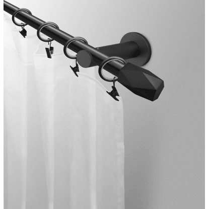 Kompletny karnisz metalowy o średnicy drążka 19 mm. Nowoczesne, otwarte wsporniki ścienne umożliwiają wygodne mocowanie drążka bez konieczności demontażu wsporników od ściany. Trzypunktowe mocowanie wsporników umożliwia stabilną instalację na wszystkich rodzajach podłoża ścian. Metalowe kółka z żabkami wyposażone w teflonową wkładkę wyciszającą.