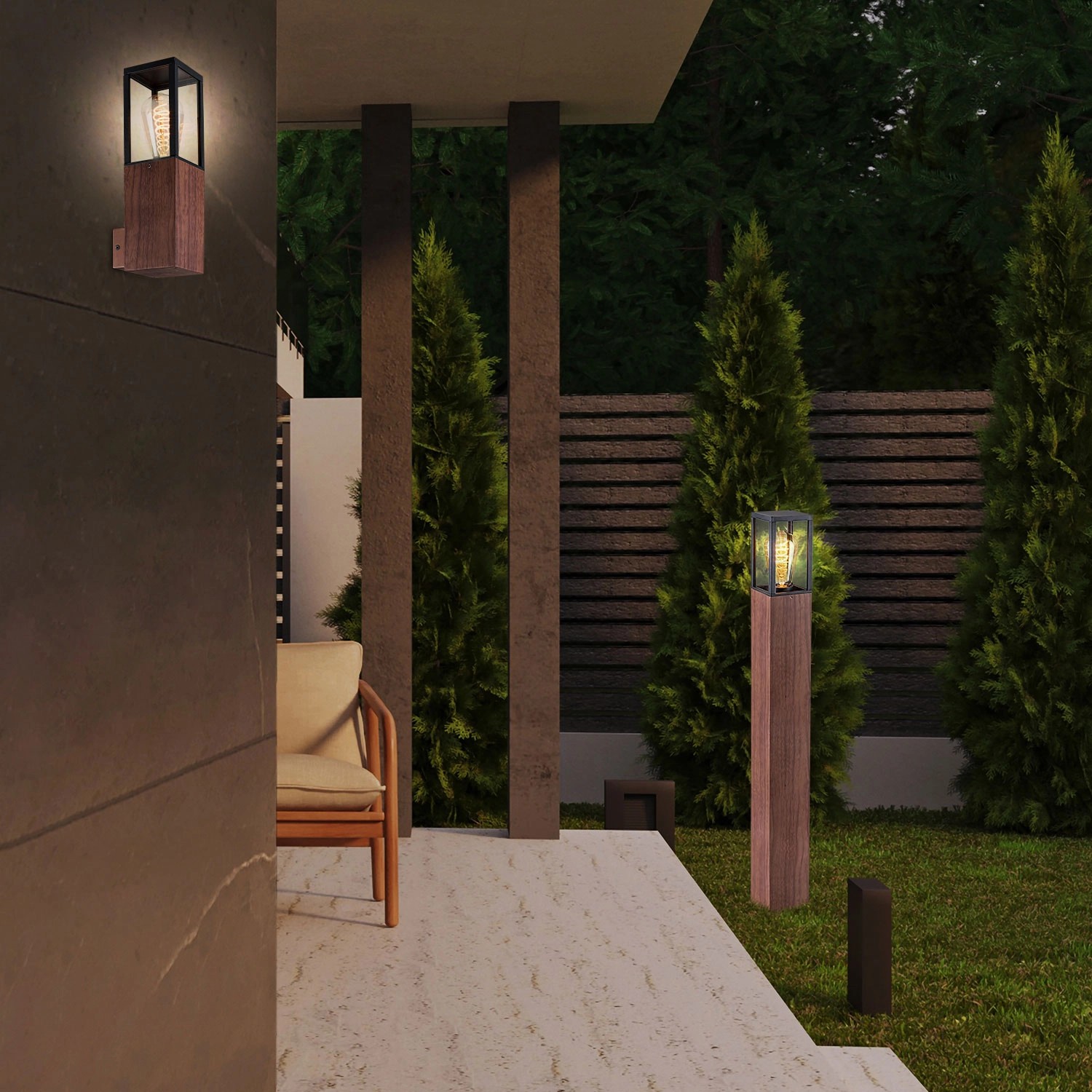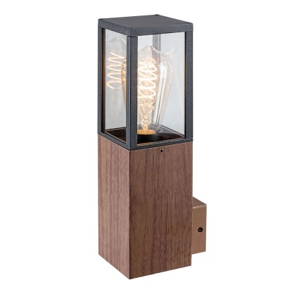 Wykonany z aluminium, trwały i solidny kinkiet zewnętrzny łączy nawiązujący do natury kolor drewna dębowego z przeźroczystym szklanym kloszem ujętym w ramę w zawsze modnym kolorze matowej czerni. Prosta forma smukłego prostopadłościanu o wymiarach [wysxszerxgł] 31 x 9 x 12 cm sprawia, że będzie wyglądał świetnie na elewacji w okolicach wejścia do budynku, ale także na tarasie czy w altanie. Szczególnie dobrze wkomponuje się w wystrój, w który prym wiodą drewniane elementy konstrukcyjne, meble i dodatki, jednak nic nie stoi na przeszkodzie, aby zestawić go z bardziej nowoczesnymi, minimalistycznymi aranżacjami.