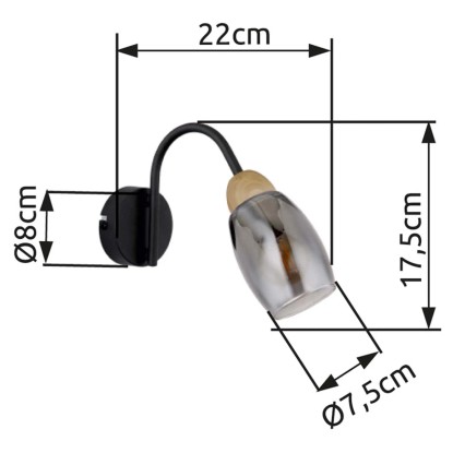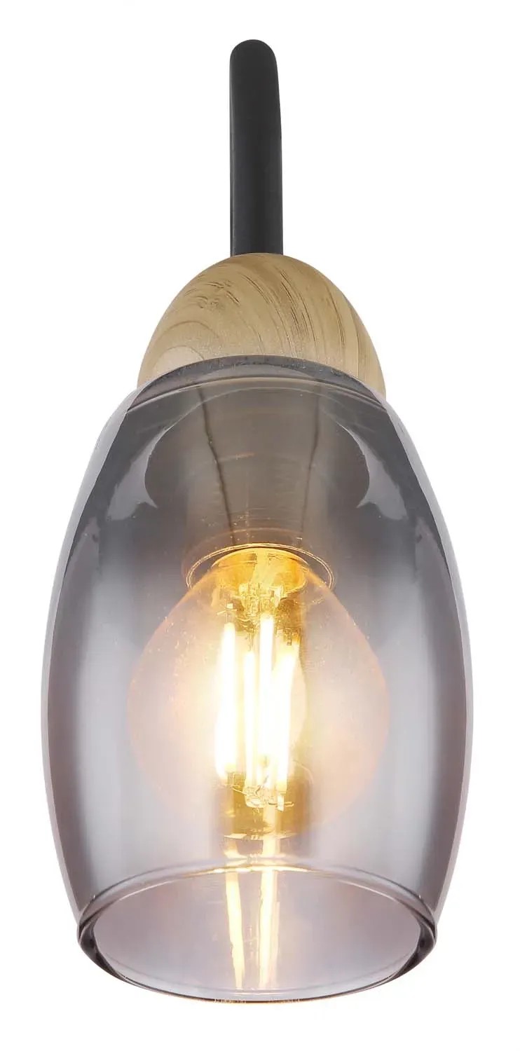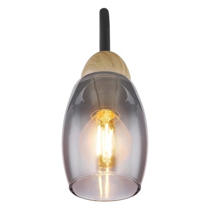 Lampa ścienna z serii GERLY inspiruje swoim eleganckim, kształtnym designem. Zakrzywiony, metalowy pręt w kolorze czarnym matowym biegnie od okrągłej podstawy ściennej do owalnego klosza o średnicy 7,5 cm, w kolorze przydymionym. Zakończenie ramienia ozdobione jest dekorem imitującym drewno, co dodaje całości konstrukcji ciepła i naturalnego charakteru.