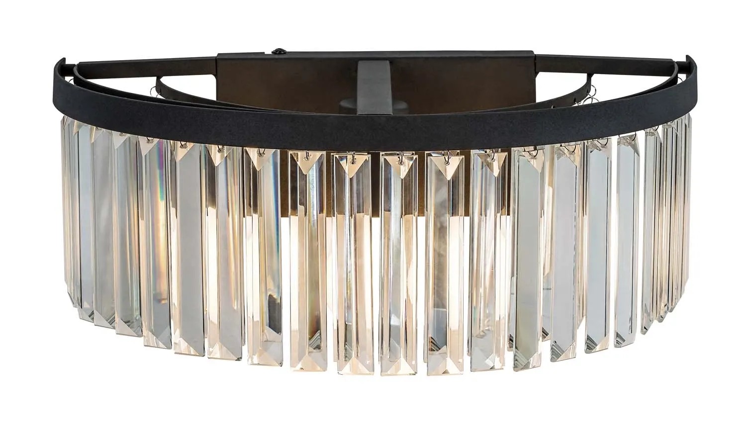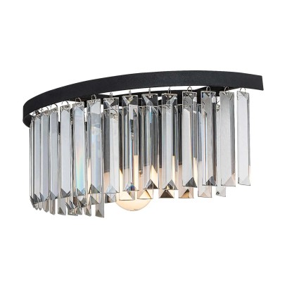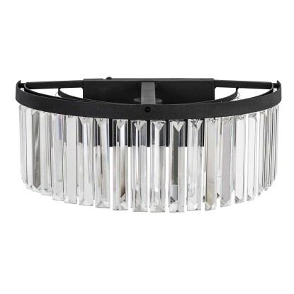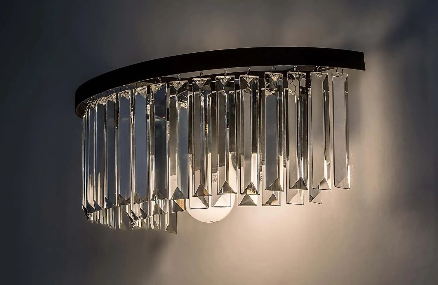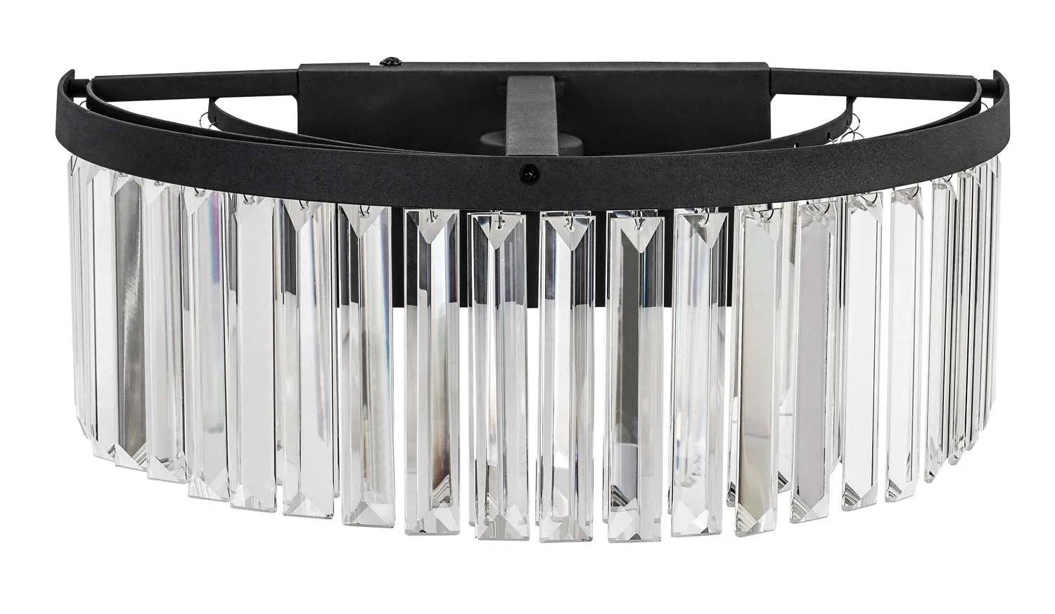 Zastosowanie transparentnych kryształków nadaje lampie wyrafinowany i luksusowy wygląd, a ciemny stelaż dodatkowo podkreśla ich blask i elegancję. Dzięki temu kinkiet prezentuje się stylowo i z klasą, a jego dekoracyjność sprawia, że staje się ciekawym elementem aranżacji wnętrza.