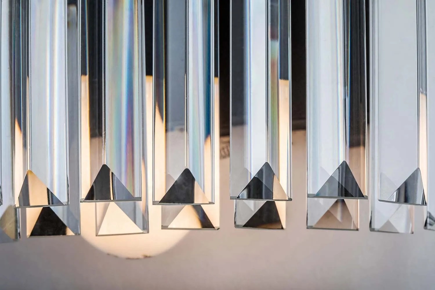 Elegancka, luksusowa stylistyka lamp Eloisa przyciąga wzrok i nadaje wnętrzu wytwornego charakteru. Konstrukcja opiera się na klasycznym designie kryształowego oświetlenia, ale w nowoczesnym wydaniu, dzięki czemu pasuje zarówno do tradycyjnych, jak i współczesnych wnętrz. Kryształowe elementy rozmieszczone w warstwach tworzą efektowną grę światła, która wprowadza do pomieszczenia wyjątkowy blask i przyjemną atmosferę.