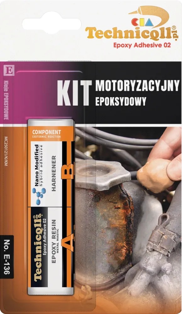 Kit motoryzacyjny epoksydowy marki Technicqll jest klejem przeznaczonym do awaryjnych i bezdemontażowych napraw urządzeń mechanicznych. Znajduje szerokie zastosowanie w warsztatach samochodowych, zakładach przemysłowych, a także gospodarstwach domowych. Klej o konsystencji plasteliny, klei i uzupełnia. Charakteryzuje się odpornością na wstrząsy i wibracje oraz na agresywne czynniki chemiczne. Tworzy mocną spoinę, nadającą się do obróbki mechanicznej i malowania. Nie przewodzi prądu. Odporny na zmienne warunki atmosferyczne.