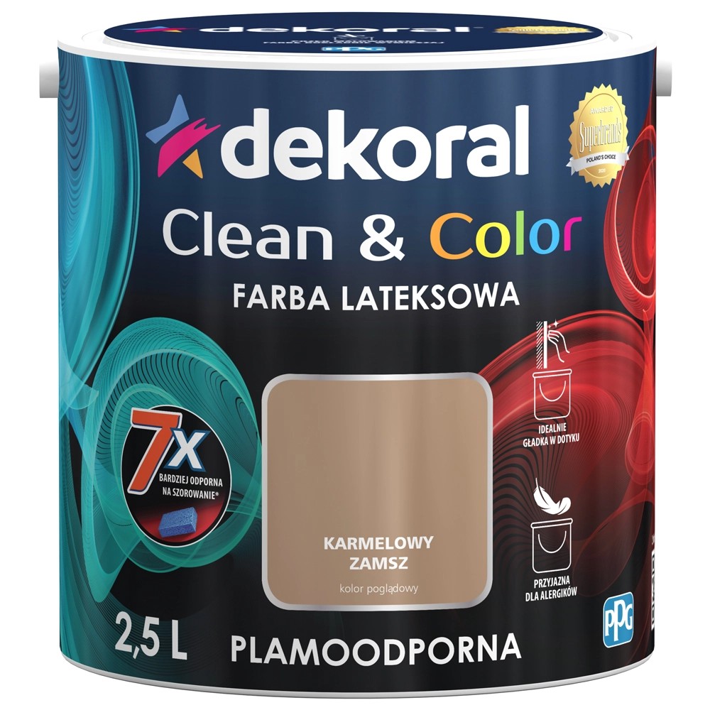 Emulsja Clean & Color marki Dekoral w kolorze karmelowy zamsz to hipoalergiczna lateksowa farba odporna na szorowanie. Przeznaczona jest do dekoracyjnego i ochronnego malowania ścian i sufitów wewnątrz pomieszczeń. Emulsja Clean & Color doskonale pokrywa tynki gipsowe, cementowe i cementowo-wapienne, powierzchnie pomalowane farbą emulsyjną, powierzchnie betonowe oraz płyty kartonowo-gipsowe, pozostawiając satynową, gładką powłokę, odporną na zabrudzenia i typowe plamy, a ich usuwanie jest bardzo łatwe. Ze względu na wyjątkowe właściwości i trwałość farba jest polecana do malowania pomieszczeń szczególnie narażonych na zabrudzenia, np. ciągi komunikacyjne, korytarze, pomieszczenia prywatne i biurowe, salony i aneksy jadalne. Jest wysoce wydajna, 1 l pozwala na pomalowanie do 15 m2 powierzchni.