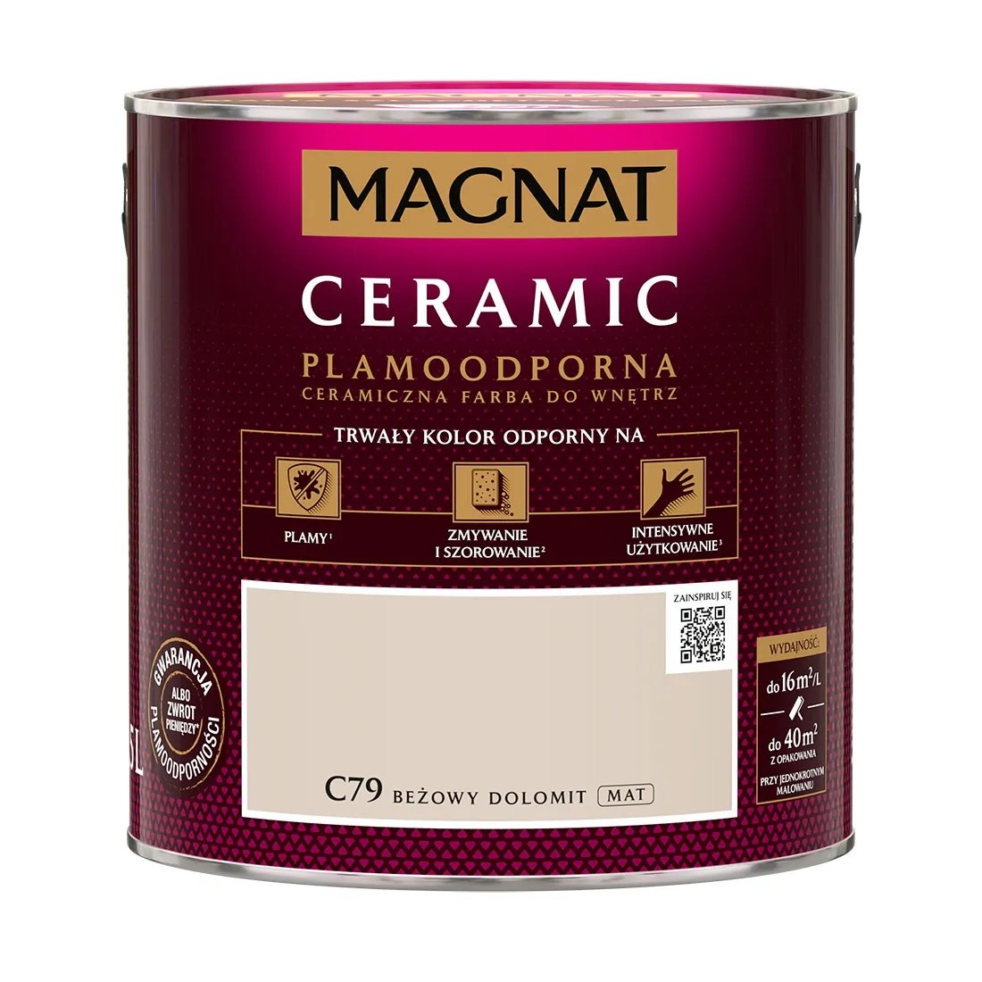 Magnat Ceramic to wysokiej jakości, innowacyjna, ceramiczna i plamoodporna farba do wnętrz, przeznaczona do dekoracyjno-ochronnego malowania ścian i sufitów wewnątrz pomieszczeń, wykonanych z zapraw cementowych, cementowo-wapiennych, gipsowych, cegły, płyt gipsowo-kartonowych, drewnianych, drewnopochodnych oraz tapet, również tych z włókna szklanego.