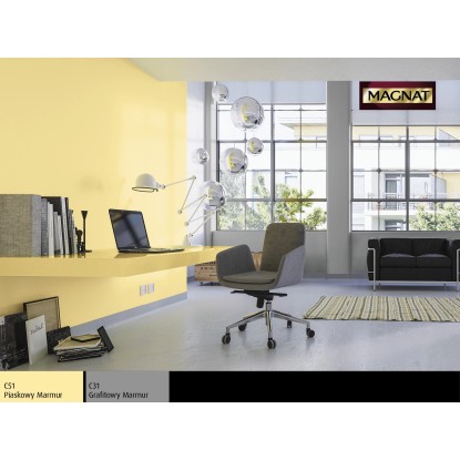 Emulsja Magnat Ceramic w kolorze piaskowy marmur to ceramiczna farba trzeciej generacji marki Śnieżka. Unikalna formuła emulsji Magnat daje jej ponadprzeciętne parametry odporności na wielokrotne zmywanie i szorowanie na mokro. Do czyszczenia można używać dezynfektantów, gdyż emulsja ta jest odporna na środki czyszczące. Powierzchnie pokryte tą farbą są plamoodporne, nie absorbują zabrudzeń i trudnych plam np. z wina, kawy, ketchupu, oleju, pisaków wodnych, kredek itp.
