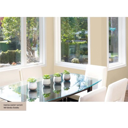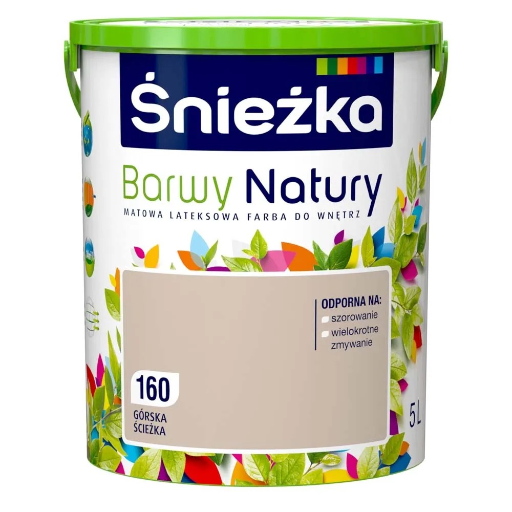 Emulsja marki Śnieżka z serii Barwy Natury w kolorze górska ścieżka to wysokiej jakości farba lateksowa. Charakteryzuje ją trwałość kolorów i bardzo dobre krycie. Na malowanej powierzchni pozostawia matową powłokę, zapewniającą oddychanie ścian, odporną na wielokrotne zmywanie i szorowanie na mokro. Szczególnie polecana jest do dekoracyjno-ochronnego malowania tynków wapiennych i cementowo-wapiennych, podłoży cementowych, betonowych, gipsowych, drewnianych i drewnopochodnych, cegły, kamienia i płyt gipsowo-kartonowych wewnątrz pomieszczeń. Jest wysoce wydajna, 1 l pozwala na pomalowanie do 14 m2 powierzchni.