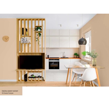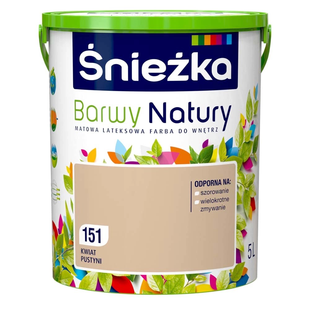 Emulsja marki Śnieżka z serii Barwy Natury w kolorze kwiat pustyni to wysokiej jakości farba lateksowa. Charakteryzuje ją trwałość kolorów i bardzo dobre krycie. Na malowanej powierzchni pozostawia matową powłokę, zapewniającą oddychanie ścian, odporną na wielokrotne zmywanie i szorowanie na mokro. Szczególnie polecana jest do dekoracyjno-ochronnego malowania tynków wapiennych i cementowo-wapiennych, podłoży cementowych, betonowych, gipsowych, drewnianych i drewnopochodnych, cegły, kamienia i płyt gipsowo-kartonowych wewnątrz pomieszczeń. Jest wysoce wydajna, 1 l pozwala na pomalowanie do 14 m2 powierzchni.