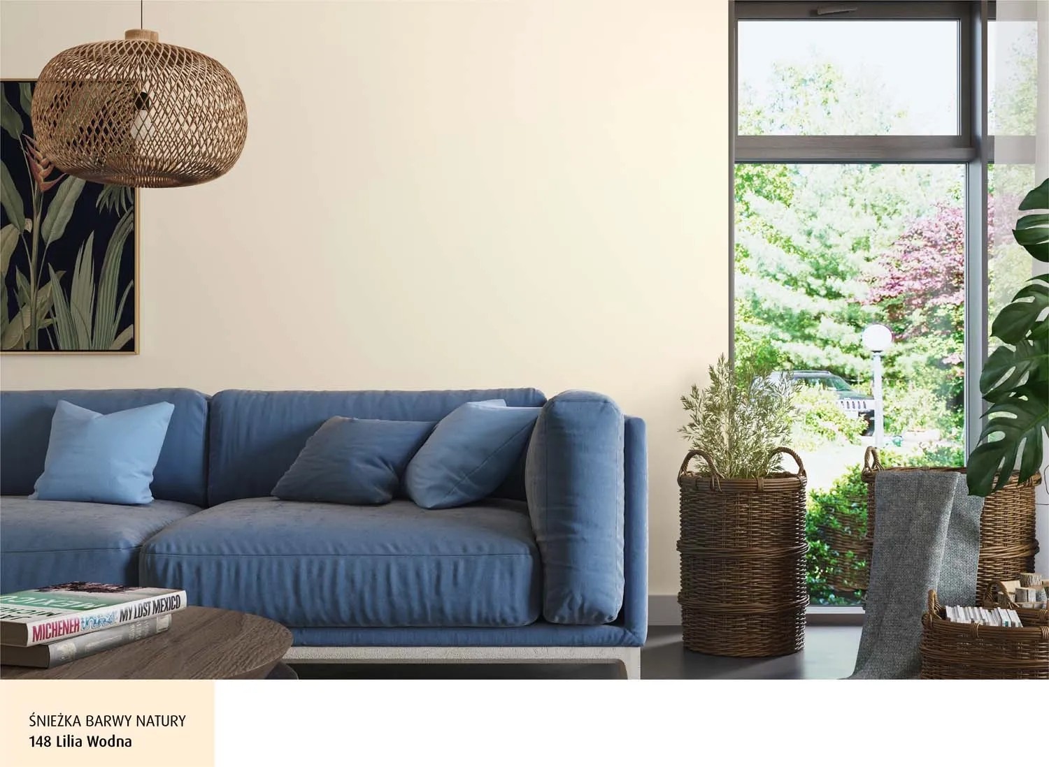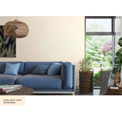 Emulsja marki Śnieżka z serii Barwy Natury w kolorze lilia wodna to wysokiej jakości farba lateksowa. Charakteryzuje ją trwałość kolorów i bardzo dobre krycie. Na malowanej powierzchni pozostawia matową powłokę, zapewniającą oddychanie ścian, odporną na wielokrotne zmywanie i szorowanie na mokro. Szczególnie polecana jest do dekoracyjno-ochronnego malowania tynków wapiennych i cementowo-wapiennych, podłoży cementowych, betonowych, gipsowych, drewnianych i drewnopochodnych, cegły, kamienia i płyt gipsowo-kartonowych wewnątrz pomieszczeń. Jest wysoce wydajna, 1 l pozwala na pomalowanie do 14 m2 powierzchni.