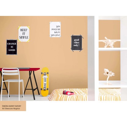 Emulsja marki Śnieżka z serii Barwy Natury w kolorze słoneczne wzgórze to wysokiej jakości farba lateksowa. Charakteryzuje ją trwałość kolorów i bardzo dobre krycie. Na malowanej powierzchni pozostawia matową powłokę, zapewniającą oddychanie ścian, odporną na wielokrotne zmywanie i szorowanie na mokro. Szczególnie polecana jest do dekoracyjno-ochronnego malowania tynków wapiennych i cementowo-wapiennych, podłoży cementowych, betonowych, gipsowych, drewnianych i drewnopochodnych, cegły, kamienia i płyt gipsowo-kartonowych wewnątrz pomieszczeń. Jest wysoce wydajna, 1 l pozwala na pomalowanie do 14 m2 powierzchni.