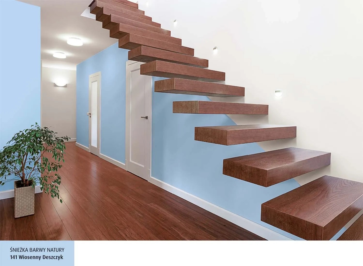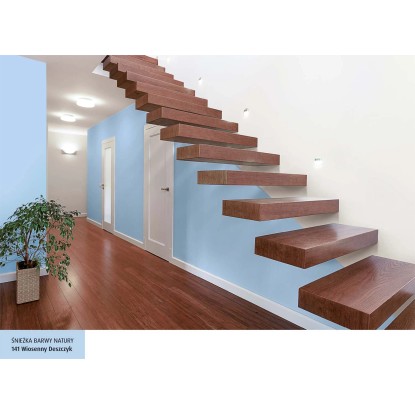 Emulsja marki Śnieżka z serii Barwy Natury w kolorze wiosenny deszczyk to wysokiej jakości farba lateksowa. Charakteryzuje ją trwałość kolorów i bardzo dobre krycie. Na malowanej powierzchni pozostawia matową powłokę, zapewniającą oddychanie ścian, odporną na wielokrotne zmywanie i szorowanie na mokro. Szczególnie polecana jest do dekoracyjno-ochronnego malowania tynków wapiennych i cementowo-wapiennych, podłoży cementowych, betonowych, gipsowych, drewnianych i drewnopochodnych, cegły, kamienia i płyt gipsowo-kartonowych wewnątrz pomieszczeń. Jest wysoce wydajna, 1 l pozwala na pomalowanie do 14 m2 powierzchni.