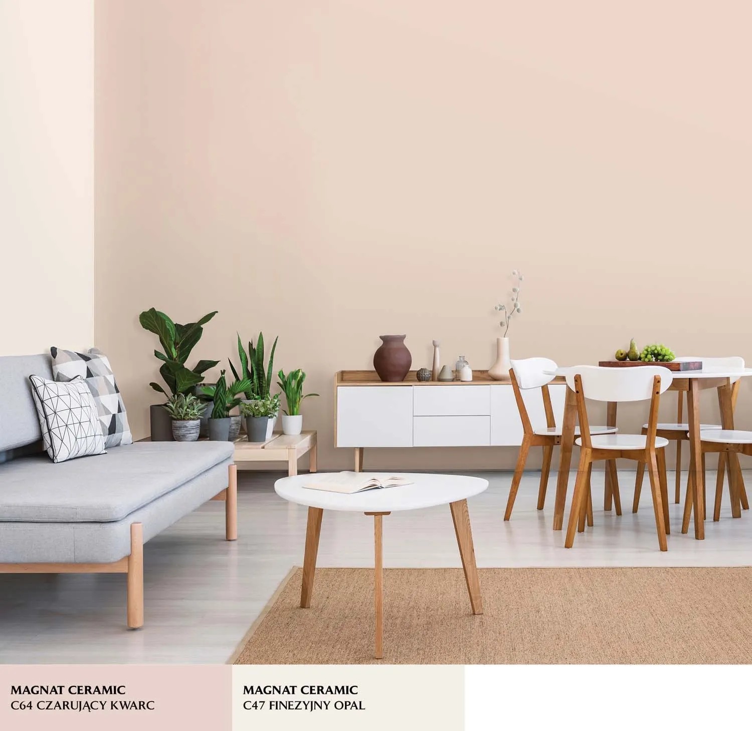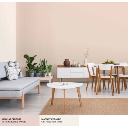 Emulsja Magnat Ceramic w kolorze czarujący kwarc to ceramiczna farba trzeciej generacji marki Śnieżka. Unikalna formuła emulsji Magnat daje jej ponadprzeciętne parametry odporności na wielokrotne zmywanie i szorowanie na mokro. Do czyszczenia można używać dezynfektantów, gdyż emulsja ta jest odporna na środki czyszczące. Powierzchnie pokryte tą farbą są plamoodporne, nie absorbują zabrudzeń i trudnych plam np. z wina, kawy, ketchupu, oleju, pisaków wodnych, kredek itp.
