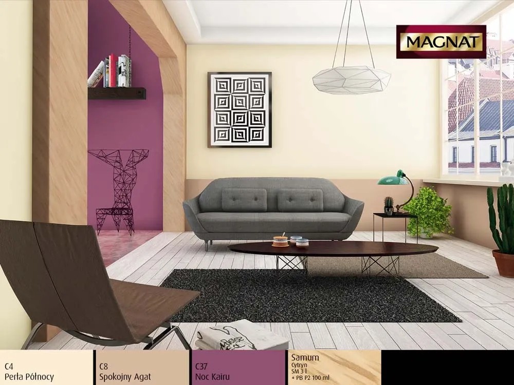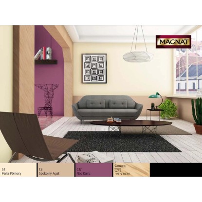 Emulsja Magnat Ceramic w kolorze spokojny agat to ceramiczna farba trzeciej generacji marki Śnieżka. Unikalna formuła emulsji Magnat daje jej ponadprzeciętne parametry odporności na wielokrotne zmywanie i szorowanie na mokro. Do czyszczenia można używać dezynfektantów, gdyż emulsja ta jest odporna na środki czyszczące. Powierzchnie pokryte tą farbą są plamoodporne, nie absorbują zabrudzeń i trudnych plam np. z wina, kawy, ketchupu, oleju, pisaków wodnych, kredek itp.