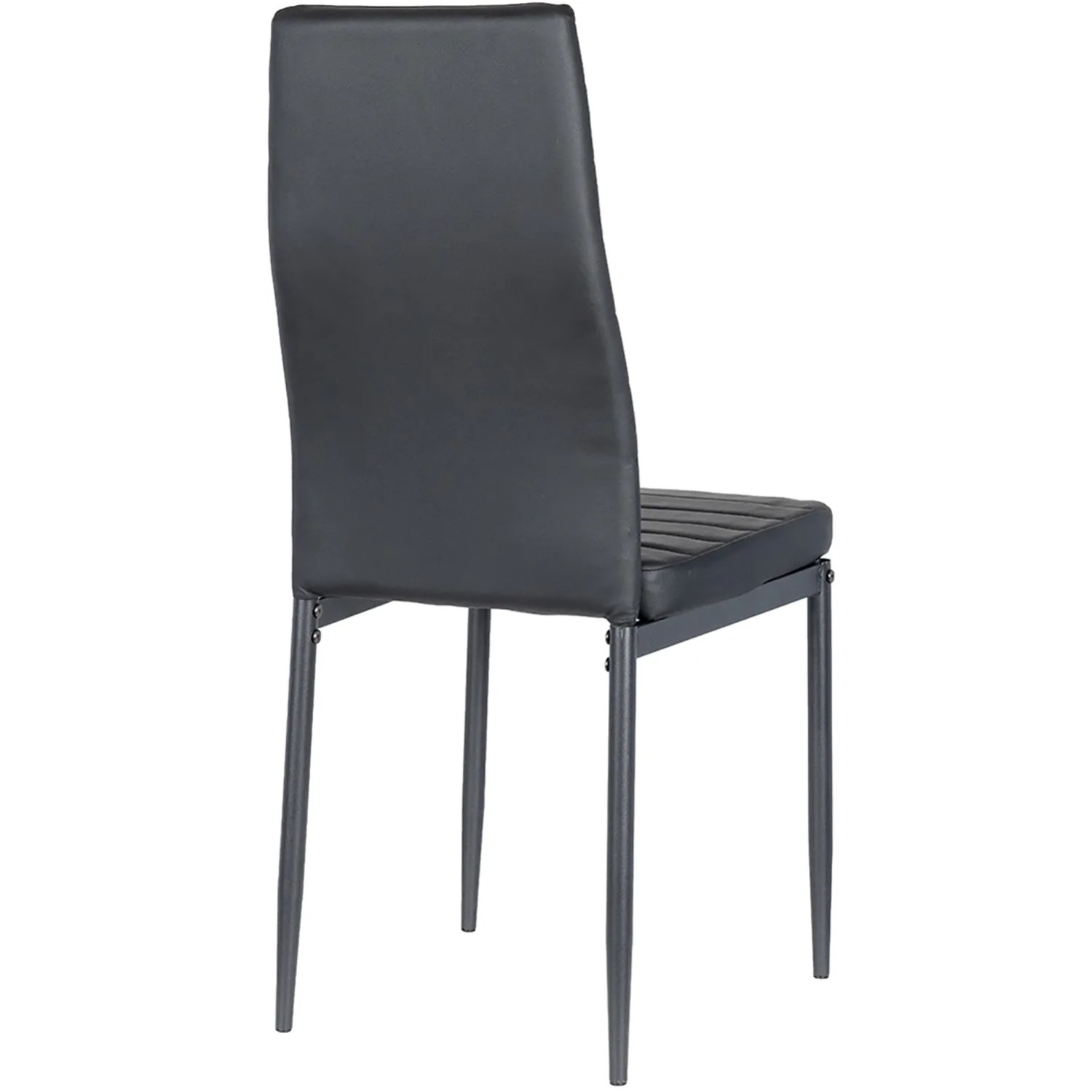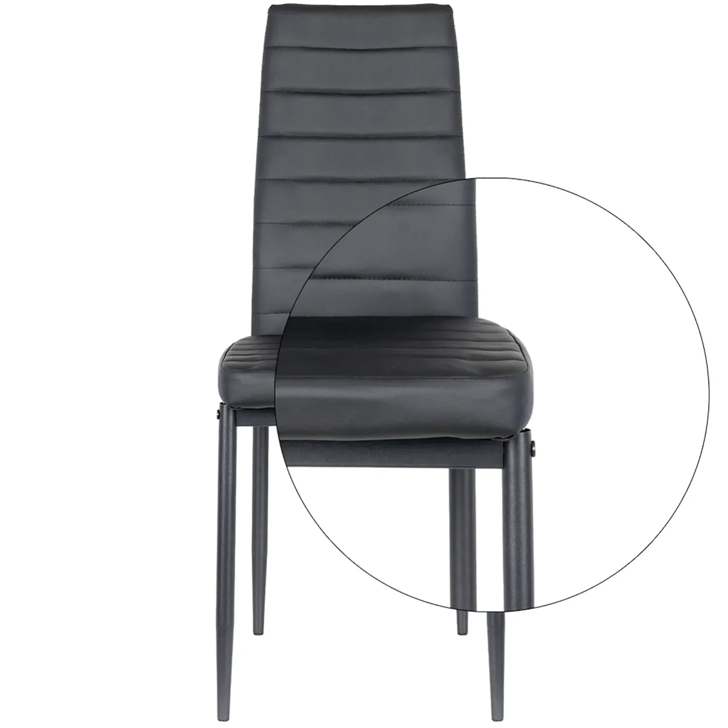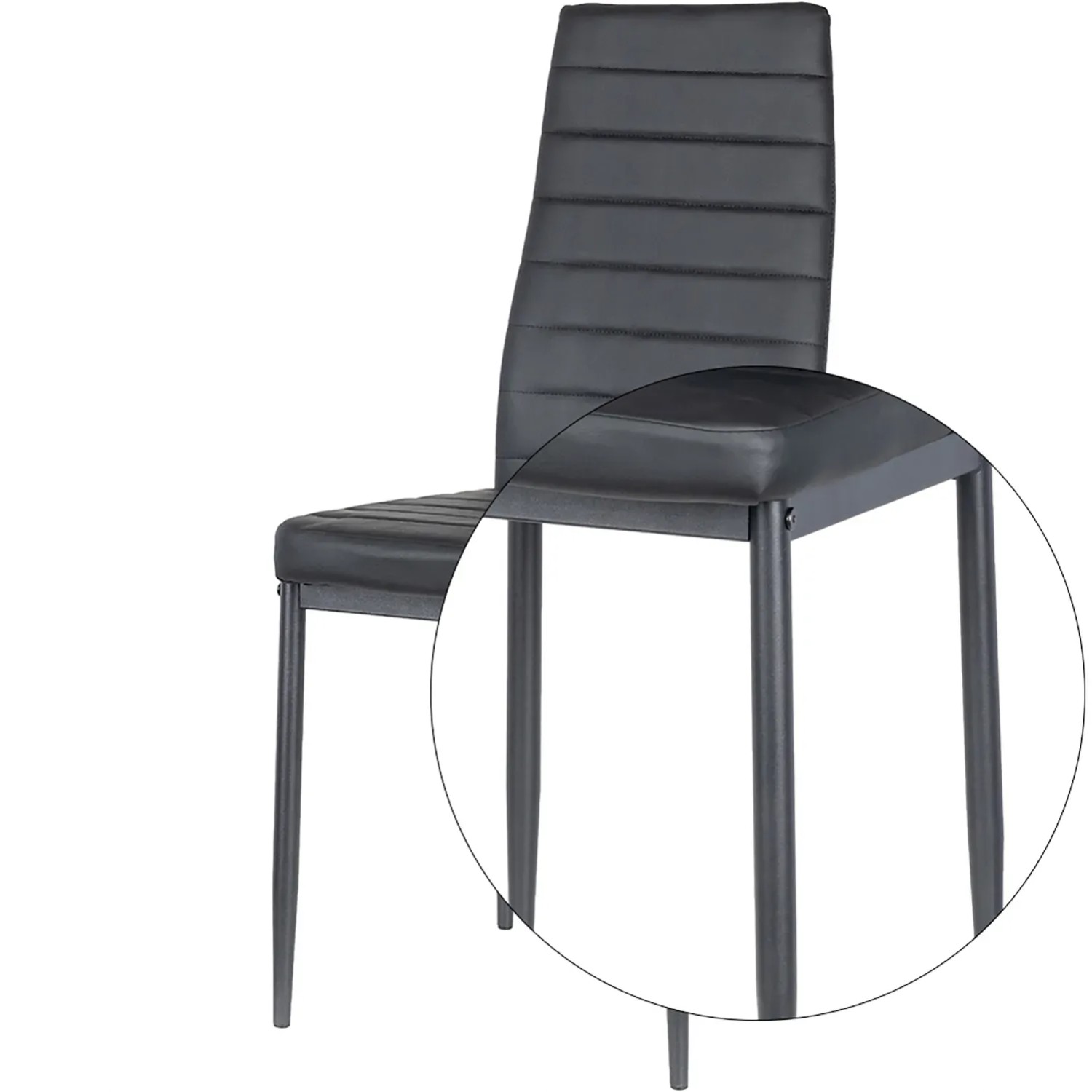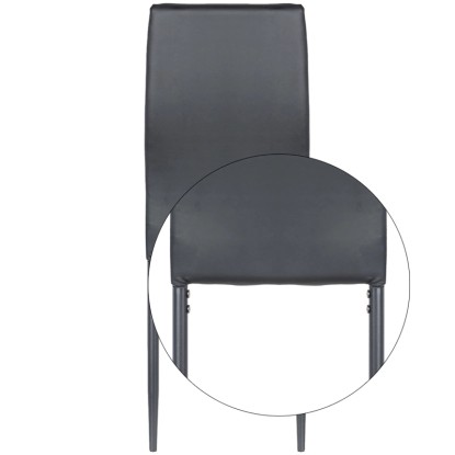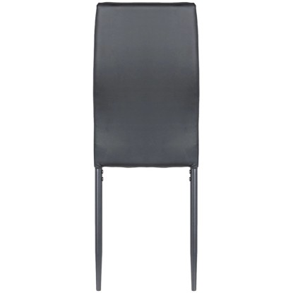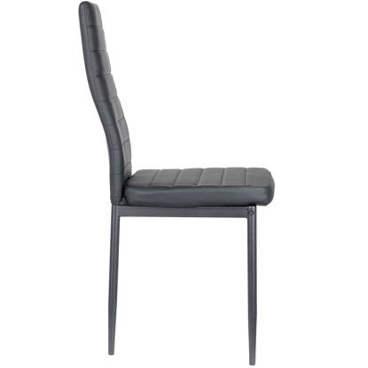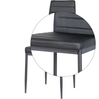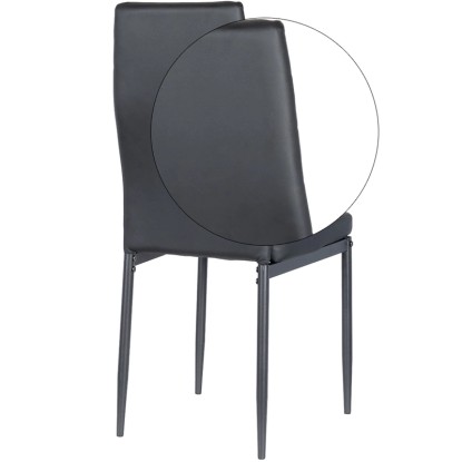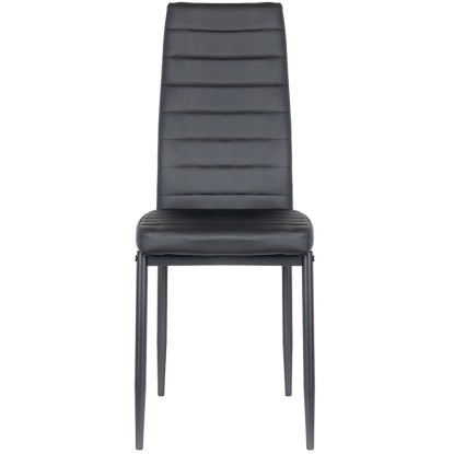 Dodaj elegancji swojej jadalni dzięki temu czarnemu krzesłu. Obszycie z wysokiej jakości ekoskóry oraz pianka o wysokiej gęstości na całej powierzchni zapewniają wyjątkowy komfort. Metalowe nogi gwarantują trwałość i nowoczesny wygląd, idealnie pasujący do współczesnych wnętrz. To stylowe i funkcjonalne krzesło sprawdzi się doskonale zarówno w jadalni, jak i w salonie czy biurze.