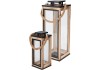 Lampion wykonany ze szkła i drewna. Blask umieszczonej w środku świecy przenikający przez przezroczyste ścianki lampionu stworzy niepowtarzalny klimat i rozświetli pomieszczenie przyjemnym ciepłym światłem.