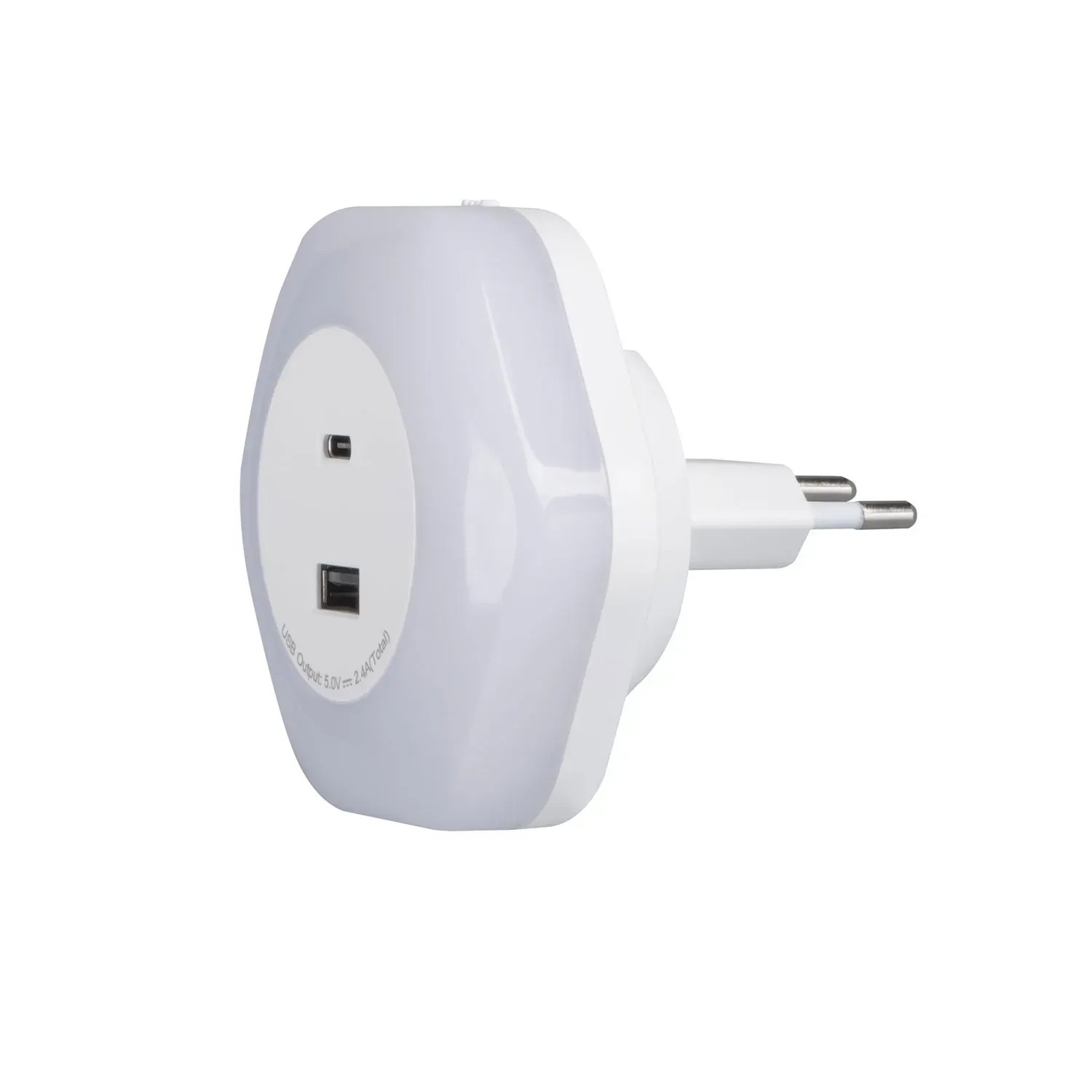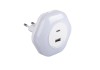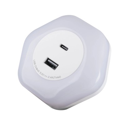 Kanlux BOLA LED to funkcjonalna lampka wtykowa z dwoma portami USB (A i C). Lampka może działać w jednym z trzech trybów - ON - stałe włączenia/OFF -stałe wyłączenie/AUTO - włącza się przy niskim natężeniu światła (lampka posiada czujnik zmierzchu).