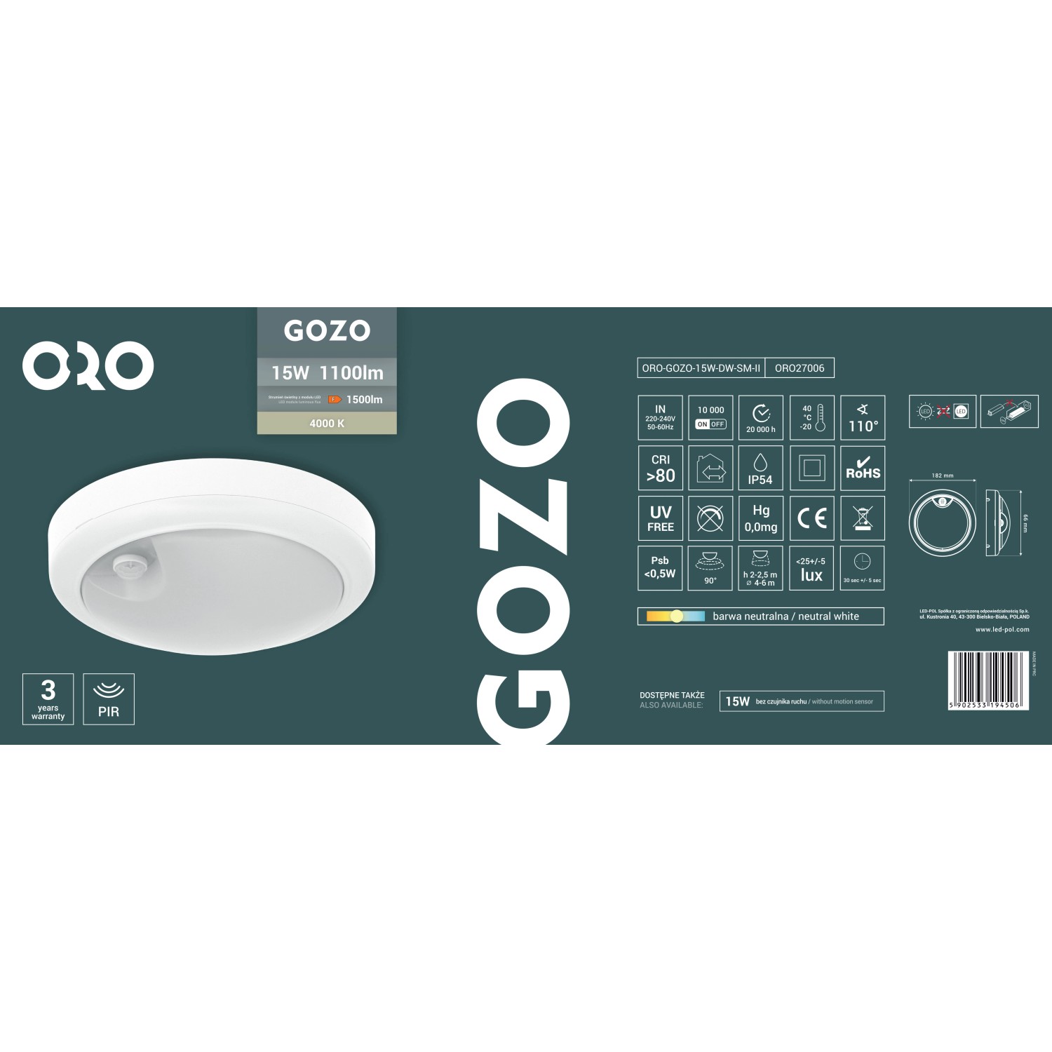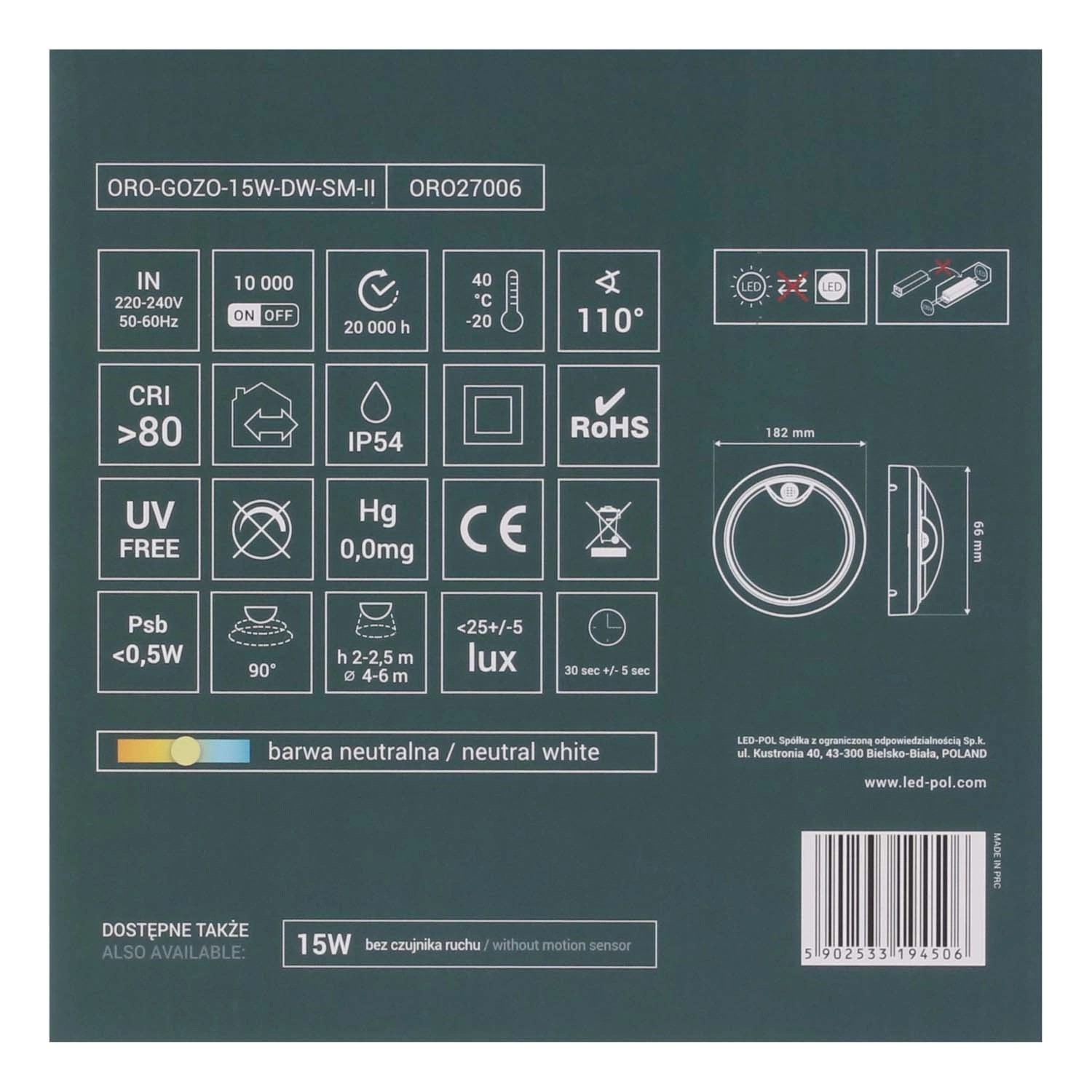 Źródło światła LED o mocy 15W dostarcza strumień świetlny na poziomie 1100 lumenów, gwarantując jasne i efektywne oświetlenie. Oprawa emituje światło o neutralnej białej barwie 4000K, która zapewnia komfortową widoczność w miejscach pracy i komunikacji.