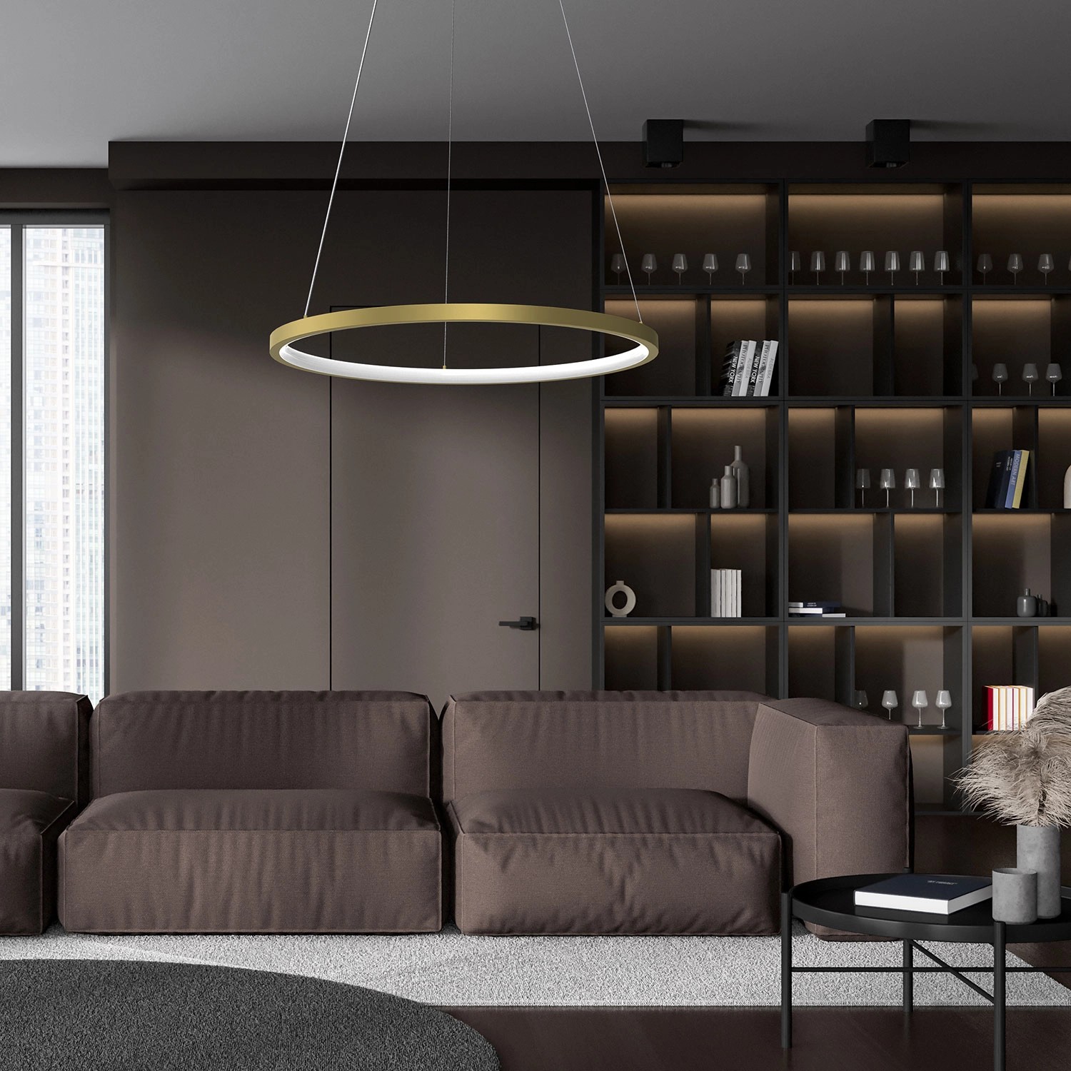 Lampa wisząca posiada dwa wymienne moduły LED o łącznej mocy 27W, zamontowane w okrągłych oprawach o średnicy 50 cm. Emitowany przez nie strumień świetlny ma neutralną, przyjemną dla oka barwę 4000K.