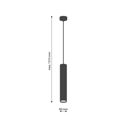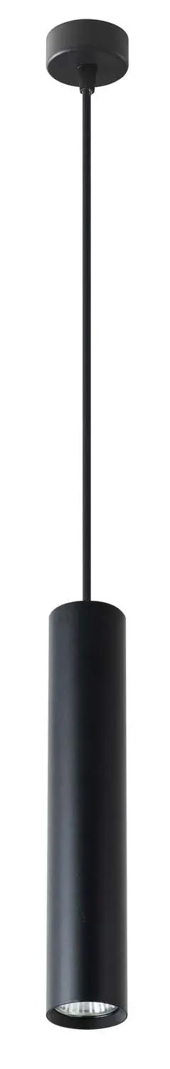 Lampa wisząca w minimalistycznym, uniwersalnym stylu, solidnie wykonana z aluminium i stali w modnym kolorze czarnym osadzona jest na podstawie o średnicy 6 cm i cienkim kablu o długości 100 cm. Prosty klosz o klasycznej formie smukłej tuby ma wymiary 5,4 x 29 cm.