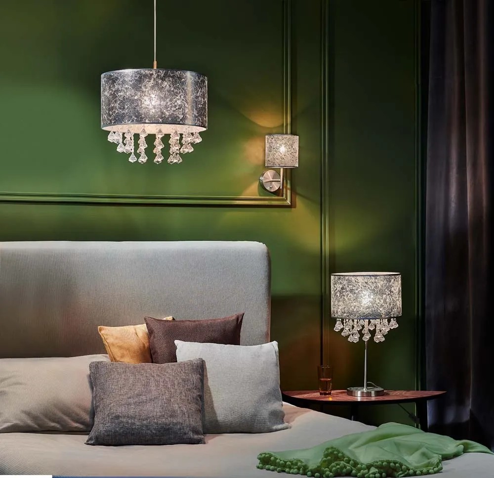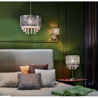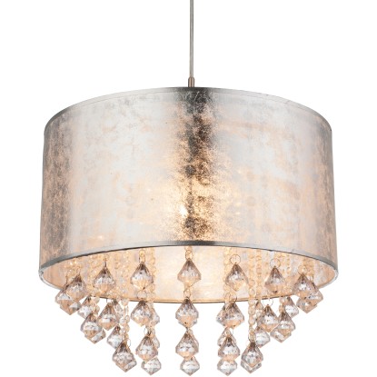 Jest to nowoczesna, ciekawa lampa składa się ze postarzanego srebrnego klosza z dodatkiem kryształków.