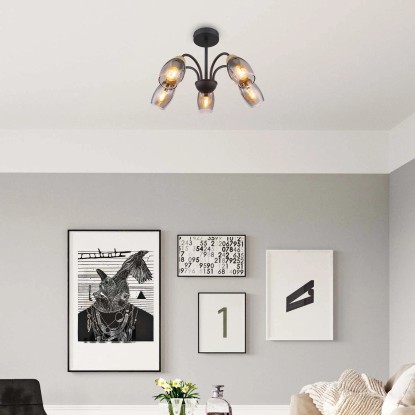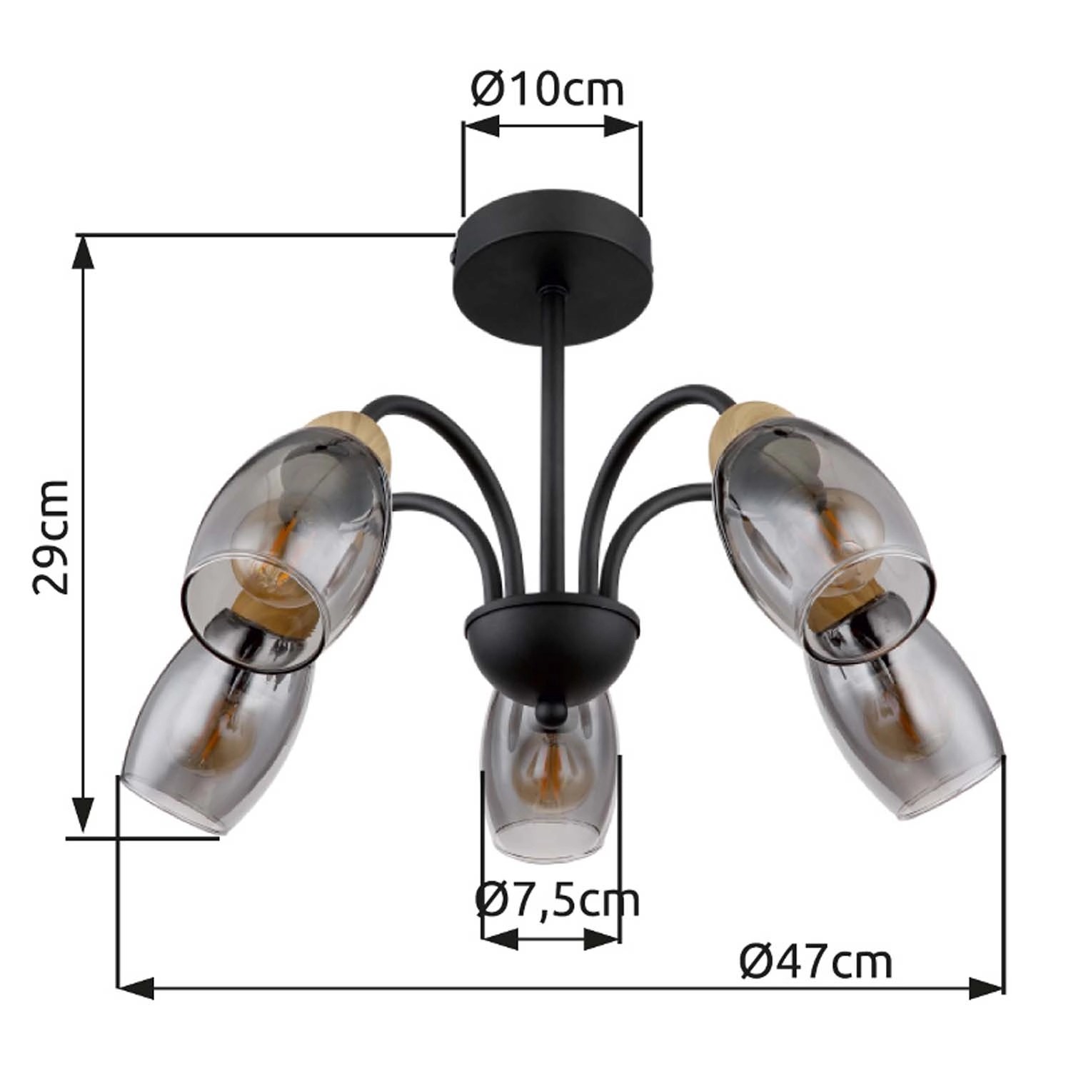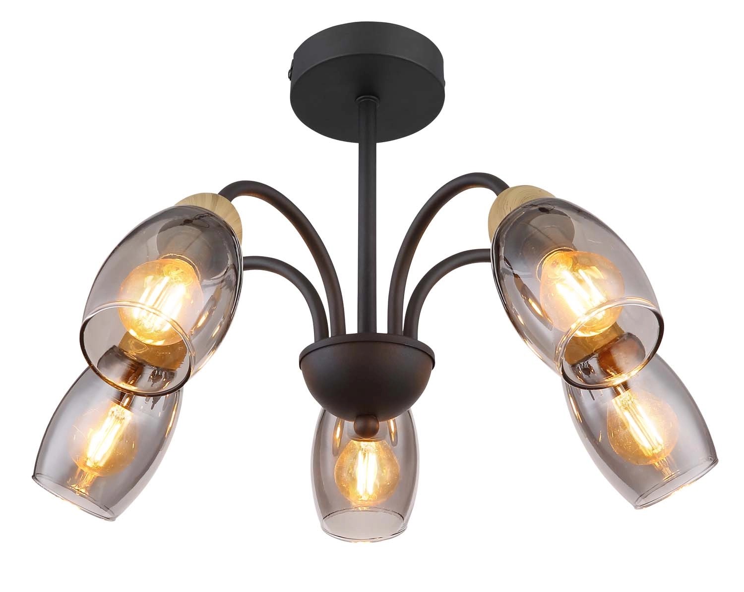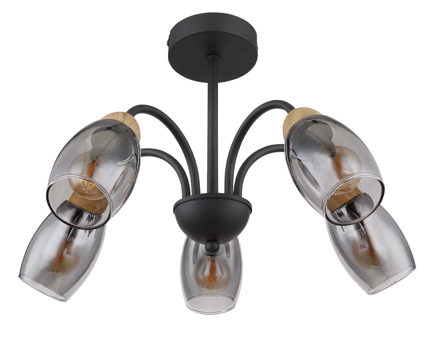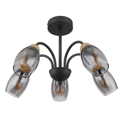 Lampa sufitowa z serii GERLY inspiruje swoim eleganckim, kształtnym designem. Pięć zakrzywionych, metalowych prętów w kolorze czarnym matowym biegnie od okrągłej podstawy sufitowej do owalnych kloszy w kolorze przydymionym. Zakończenia ramion ozdobione są dekorem imitującym drewno, co dodaje całości konstrukcji ciepła i naturalnego charakteru.