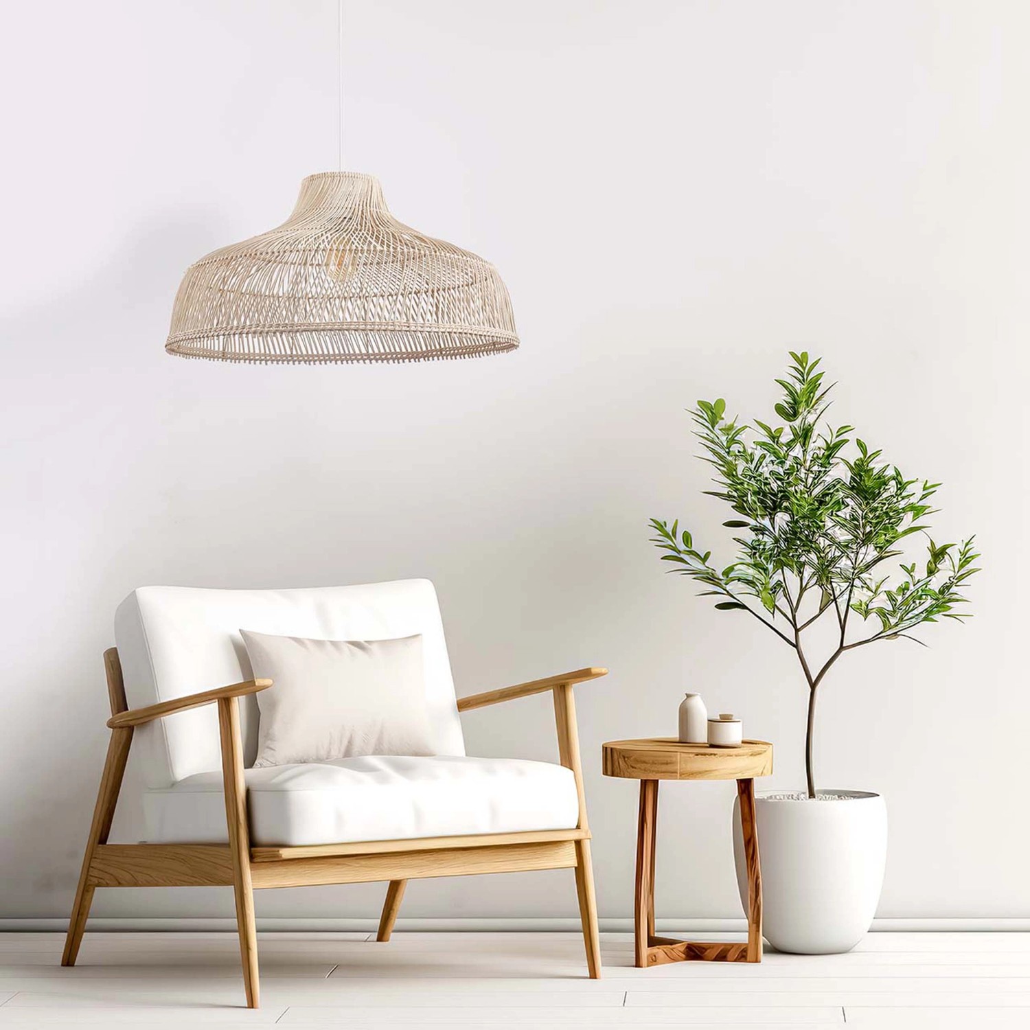 Szeroki klosz o klasycznej formie dodaje lampie ponadczasowego charakteru i uniwersalności. Pleciona struktura pozwala światłu przenikać przez szczeliny, tworząc delikatny efekt świetlny na ścianach i suficie. Ta ciekawa lampa wprowadzi do pomieszczenia unikalny klimat przywodzący na myśl egzotyczne kraje.