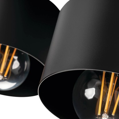 Trzy klosze zamontowane są na różnych wysokościach i osadzone na okrągłej czarnej podsufitce, co nadaje całości dynamiczny ale ponadczasowy wygląd. Lampa będzie eleganckim dodatkiem do wielu przestrzeni, jednocześnie nie przytłaczając wystroju i komponując się na równi z jasnymi, jak i z ciemnymi meblami.