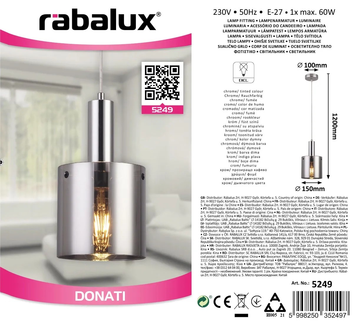 Rabalux Lampa wisząca Donati 1x60W E27 chrom