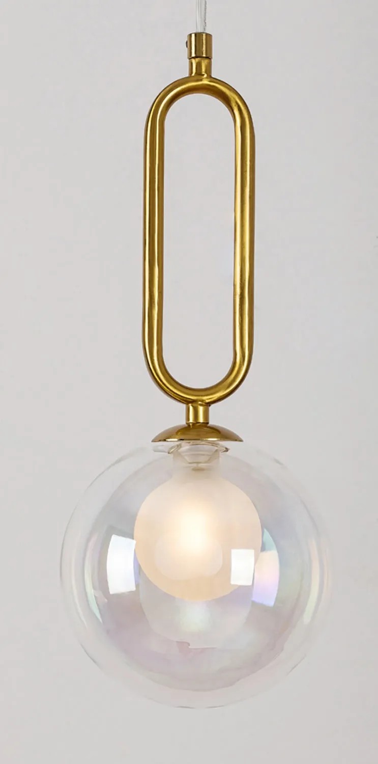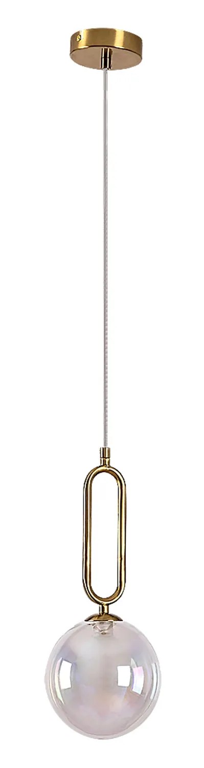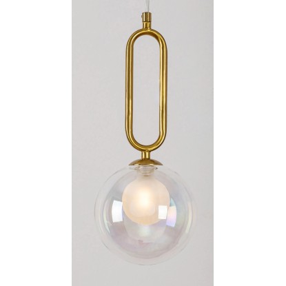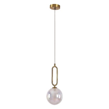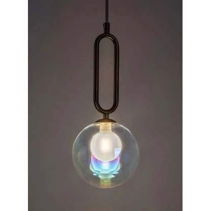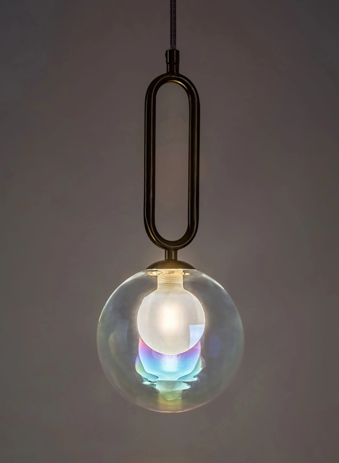 Metalowa oprawa wisząca składa się z korpusu w kolorze szampańskim oraz wielokolorowego, kulistego klosza szklanego. Klosz zwisa z sufitu na długim kablu. Za pomocą oprawy możemy stworzyć wspaniałą atmosferę, niezależnie od tego czy zastosujemy źródło światła o ciepłej czy neutralnej barwie.