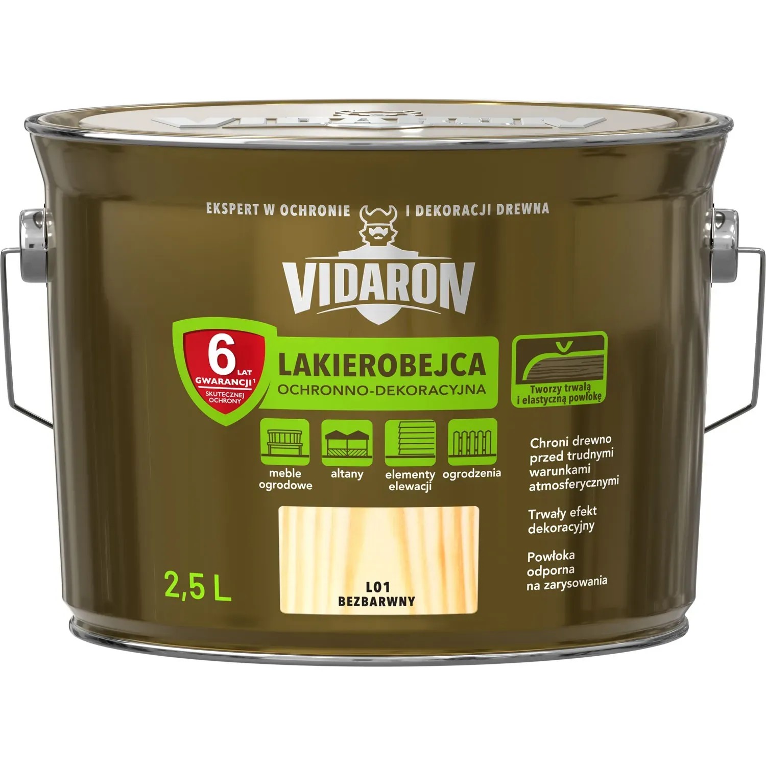 Wysokiej jakości lakierobejca ochronno-dekoracyjna z dodatkiem Teflon surface protector. Tworzy na drewnie trwałą i elastyczną powłokę odporną na ścieranie. Skutecznie zabezpiecza drewno przed działaniem słońca (UV), wody, śniegu i mrozu jednocześnie zachowując naturalny rysunek słojów drewna. Zapewnia 6 letnią gwarancję skutecznej ochrony. Przeznaczona jest do ochronno-dekoracyjnego malowania drewna i materiałów drewnopochodnych użytkowanych wewnątrz i na zewnątrz budynków tj. elementów stolarki budowlanej, boazerii, listew dekoracyjnych, mebli, kasetonów, drzwi, okien, altan, płotów, architektury ogrodowej itp. Pod lakierobejcę wymagany jest Vidaron Impregnat Ochronny Gruntujący Bezbarwny jako podkład biologicznie zabezpieczający malowane drewno. Produkt nie jest przeznaczony do lakierowania drewnianych podłóg, schodów, ciągów komunikacyjnych. W przypadku nietypowych zastosowań (np. materiały drewniane stosowane w dekarstwie, egzotyczne gatunki drewna, okładziny korkowe itp.) użycie wyrobu należy skonsultować z Producentem.