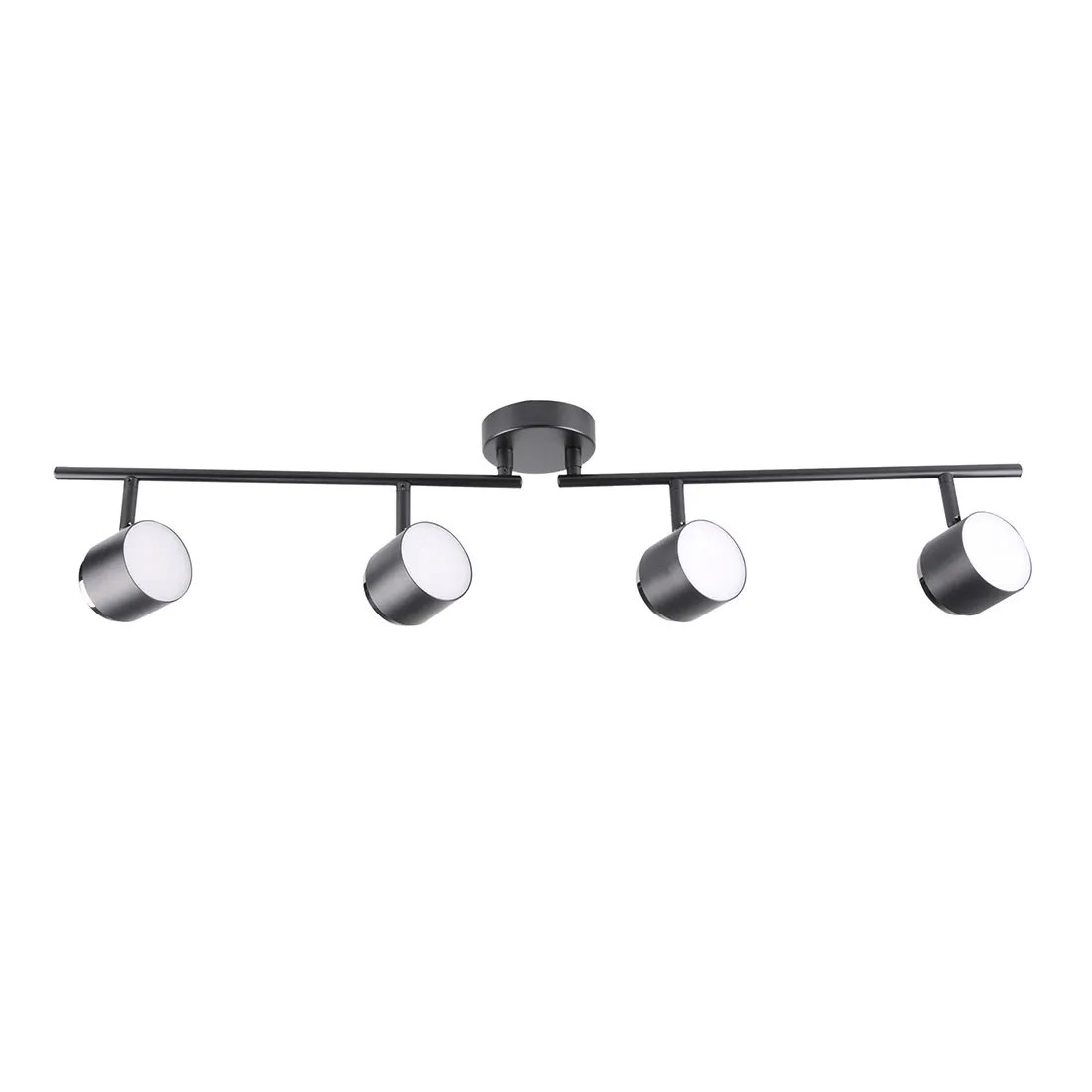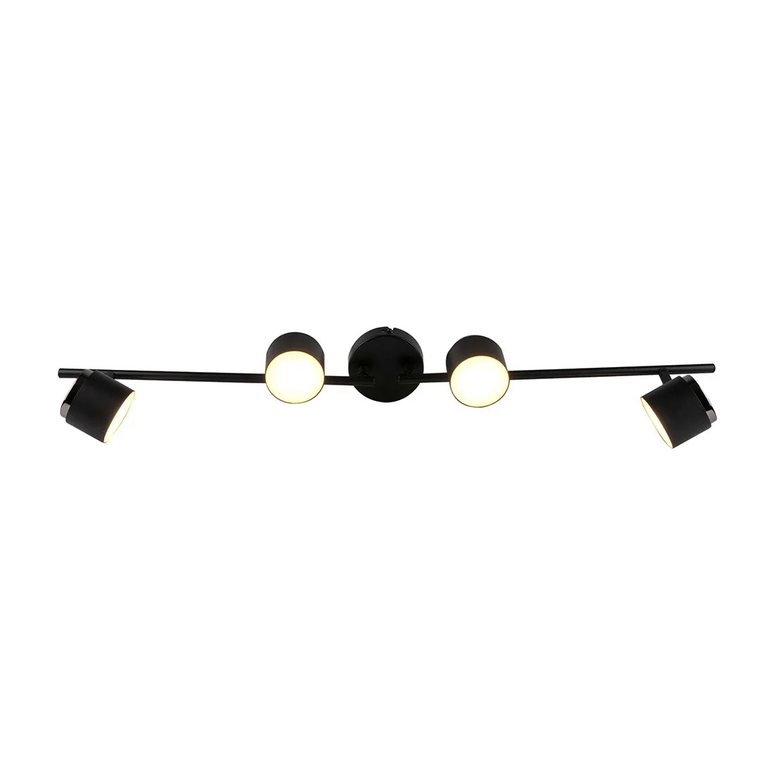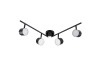 Lampa ścienno-sufitowa metalowa w kolorze czarnym, z czterema źródłami światła. Posiada ruchome abażury wykończone na górze srebrną obwódką. Mocowanie stanowi podwójna ruchoma listwa.