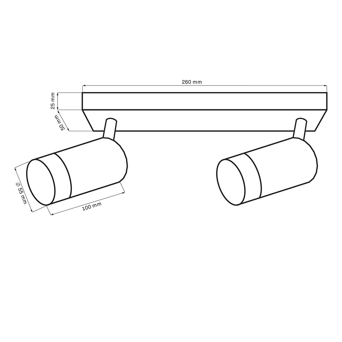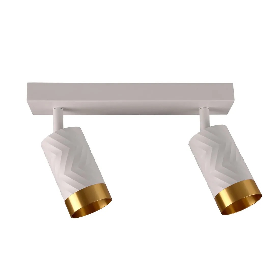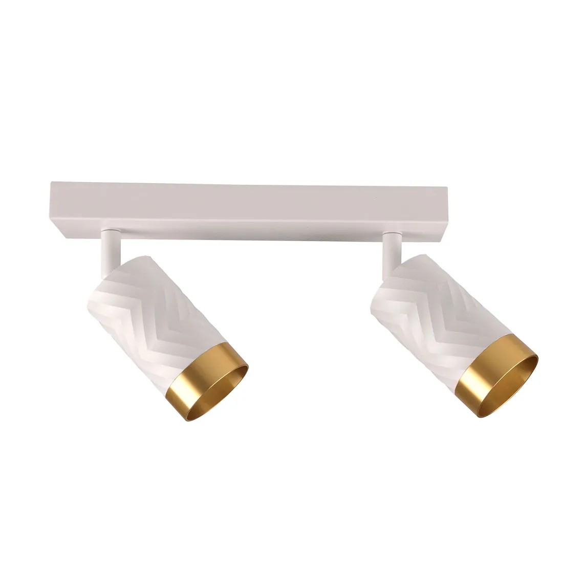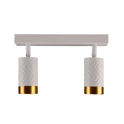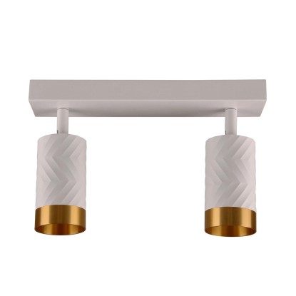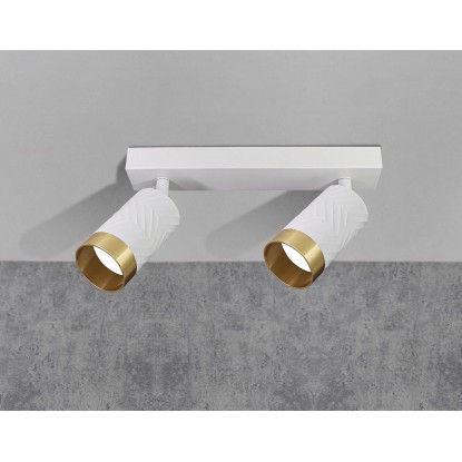 Biała listwa do zamocowania na suficie lub ścianie z dwoma ruchomymi punktami świetlnymi w ponadczasowym kształcie tuby wykonana jest z metalu i wykończona eleganckimi złotymi pierścieniami. Jest to wszechstronne i funkcjonalne rozwiązanie oświetleniowe dające możliwość montażu energooszczędnych źródeł światła. Wymienne źródło światła stanowią dwie żarówki na gwint GU10 o maksymalnej mocy 10W LED. Produkt sprzedawany jest bez żarówek, należy je zakupić osobno. Komplet zawiera także instrukcję obsługi i kołki montażowe.
