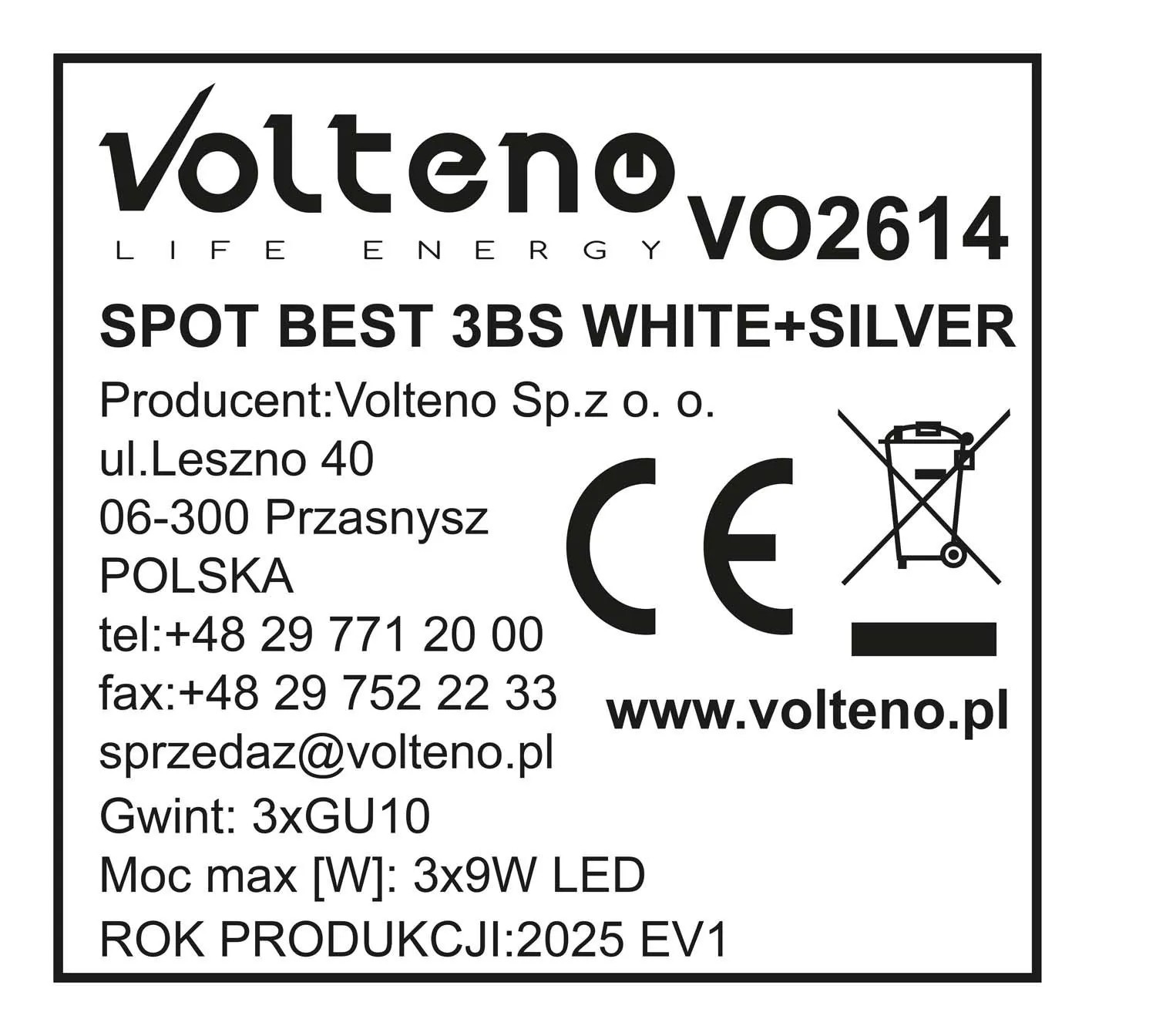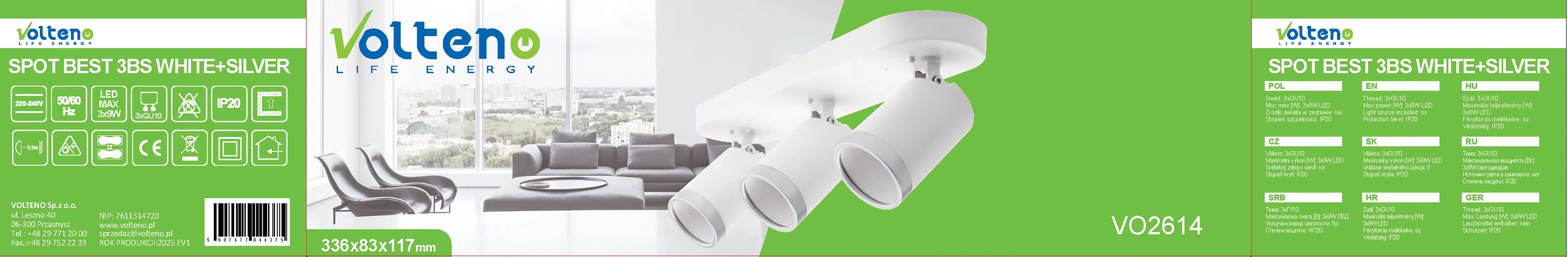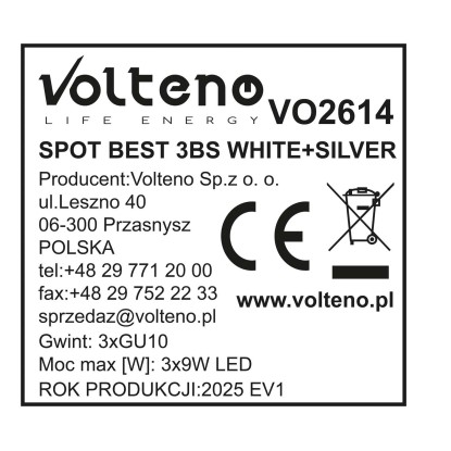 Volteno Listwa Spot BEST 3xGU10 max. 9W LED biało-srebrna