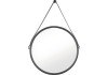 Lustro ścienne z drewnianą ramą, okrągłe, czarne. Z brązowym paskiem o wyglądzie skóry i drewnianym haczykiem do łatwego zawieszenia.