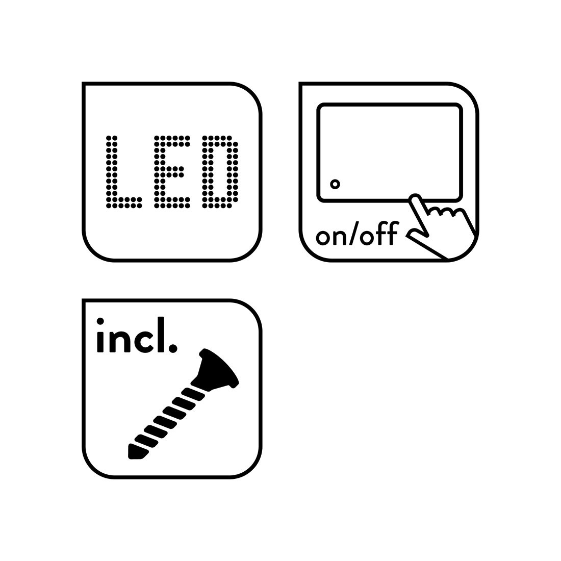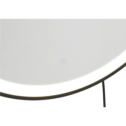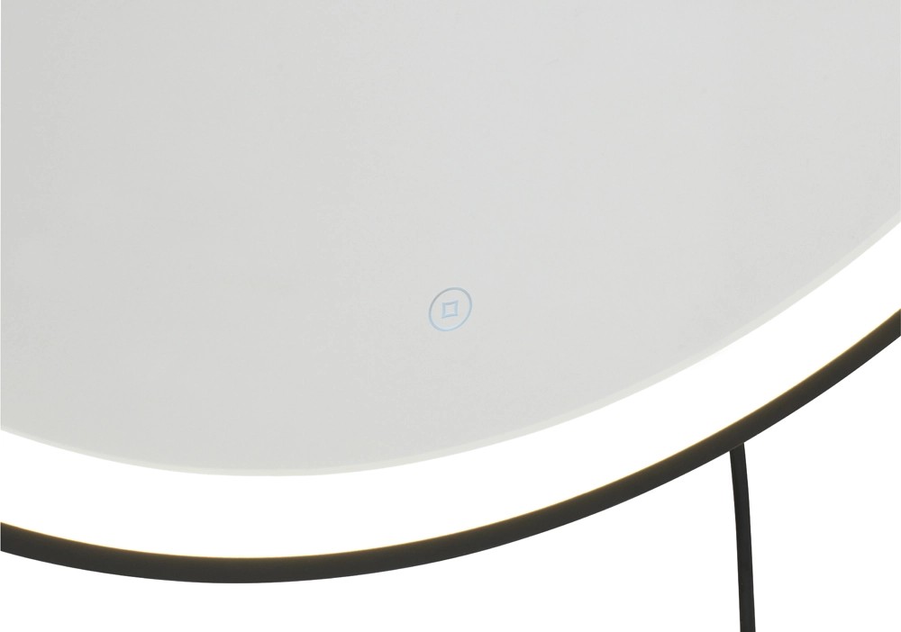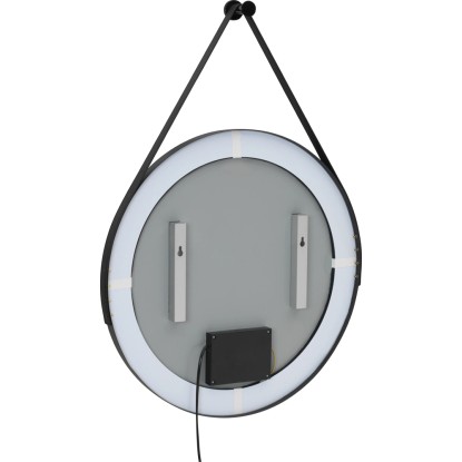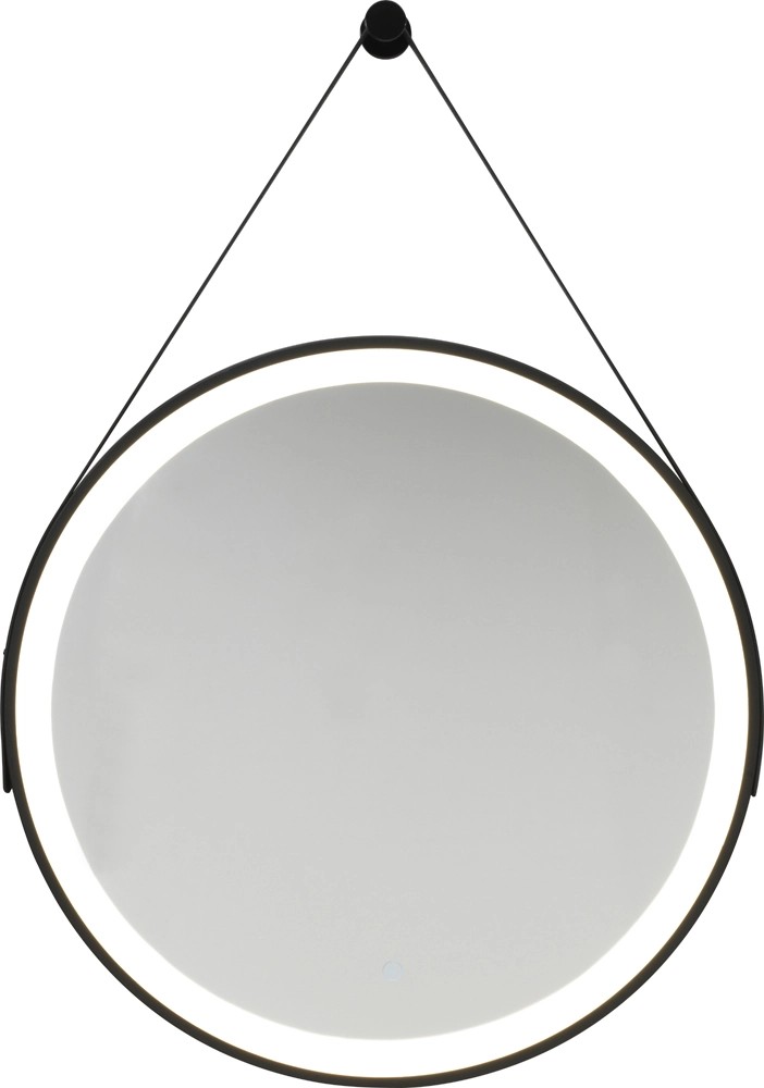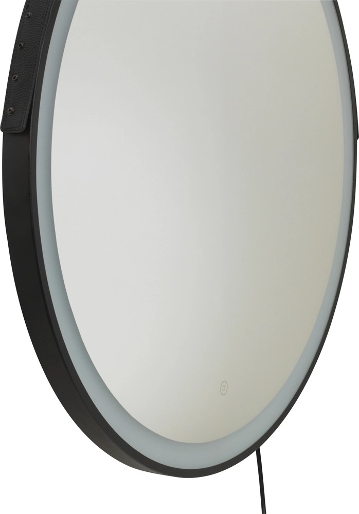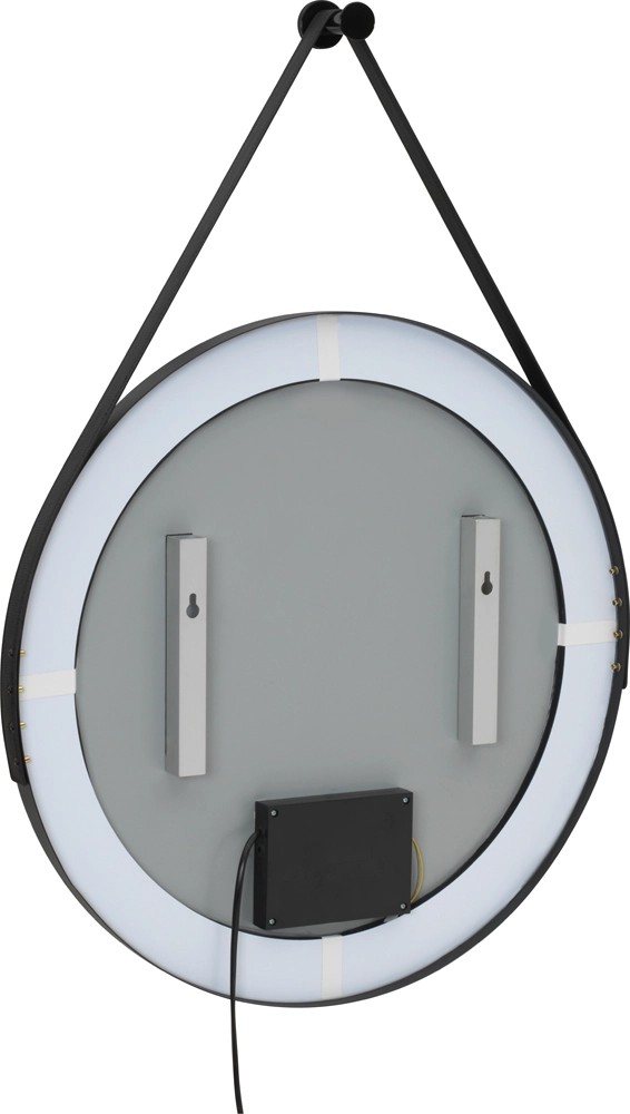 Okrągłe lustro ścienne LED z czarną ramą metalową i włącznikiem dotykowym. Barwa światła: zimna biel (4000 K). Z regulowanym paskiem skórzanym do prostego powieszenia. Z materiałem montażowym w komplecie, bez narzędzi. Moc max 18W. Wysokość lustra wraz z paskiem montażowym: 86cm. Średnica lustra: 60cm.
