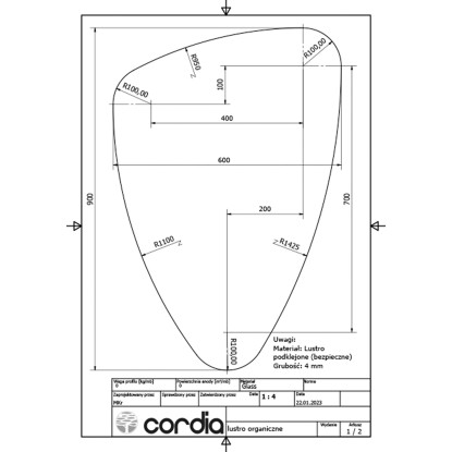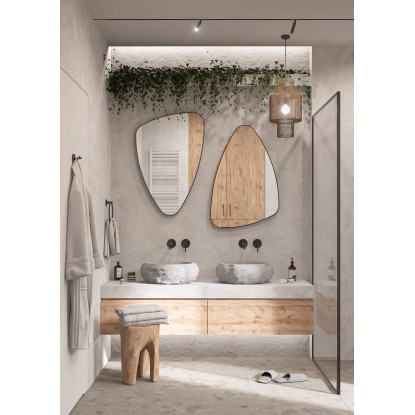 Lustro bez LED Organic Line ma grubość szkła 4 mm, co zapewnia trwałość i stabilność. Jego wymiary wynoszą 90 x 60 cm, co czyni je idealnym do średnich i większych przestrzeni. Odległość lustra od ściany to 20 mm, co gwarantuje estetyczny montaż. Czarna rama nadaje mu nowoczesny i elegancki charakter, podkreślając jego organiczny kształt. Jest to stylowy element dekoracyjny, który wniesie unikalny akcent do każdego wnętrza.