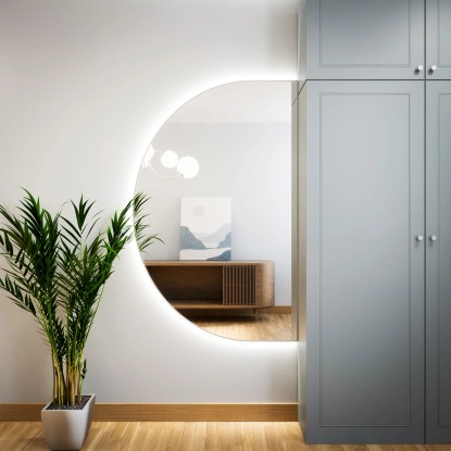 Zaprojektowane z myślą o nowoczesnym stylu produkty z serii Tiny Border Semi Round doskonale sprawdzają się jako lustra łazienkowe, do salonu czy lustra do przedpokoju. Kombinacja funkcjonalności i estetyki w połączeniu z minimalistycznym obramowaniem sprawiają, że to lustro nadaje pomieszczeniu świeży i niekonwencjonalny wygląd. Oprócz tradycyjnego zawieszenia w pionie, lustro można również łatwo zamontować w pozycji poziomej, co otwiera możliwości aranżacyjne dla Twojego wnętrza. Jest to produkt najwyższej klasy, produkowany w Polsce.