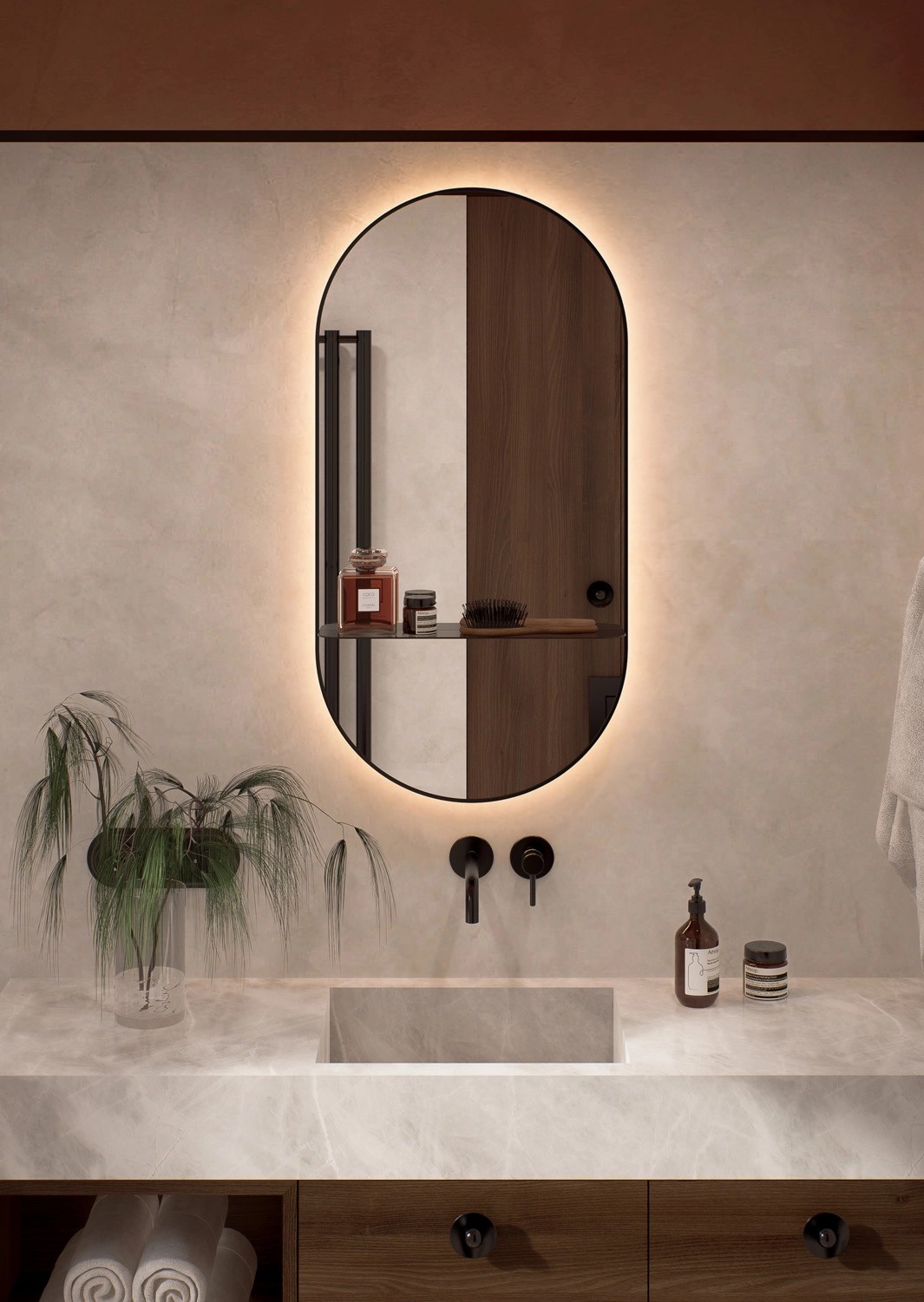 Lustro z LED Oval Line czarna rama z półką 100x50