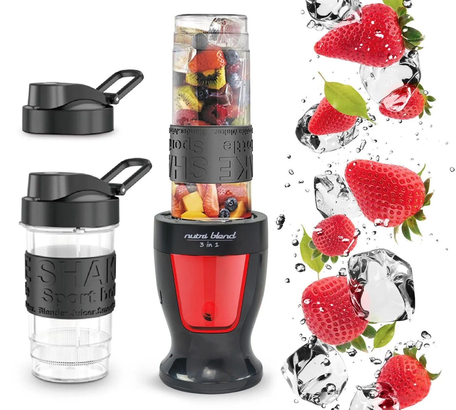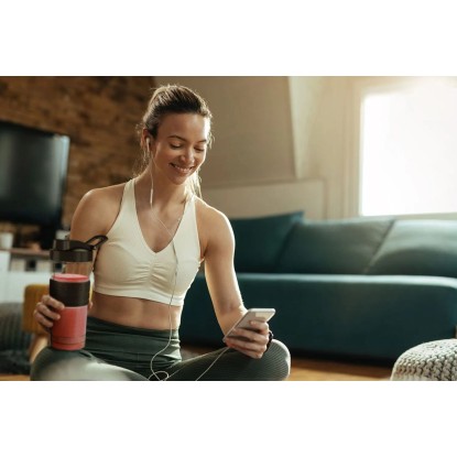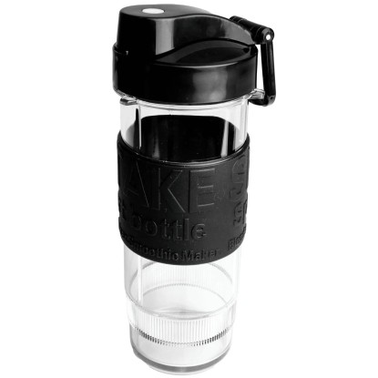 W zestawie znajdują się dwie poręczne butelki o pojemnościach 570 ml oraz 400 ml. Każda z nich wyposażona jest w silikonowy uchwyt poprawiający ergonomię, a także praktyczne pokrywki: jedną z zamknięciem do picia i drugą z uchwytem transportowym. Tak przygotowany koktajl można wygodnie zabrać ze sobą do pracy, na trening, spacer czy uczelnię.