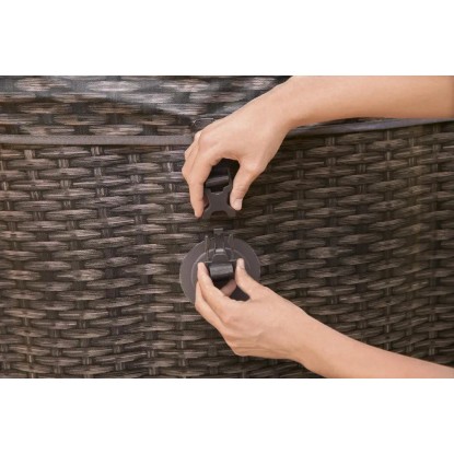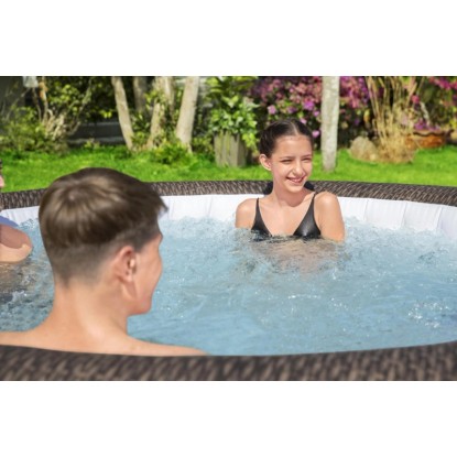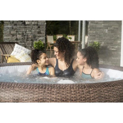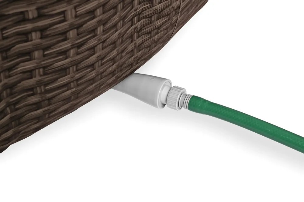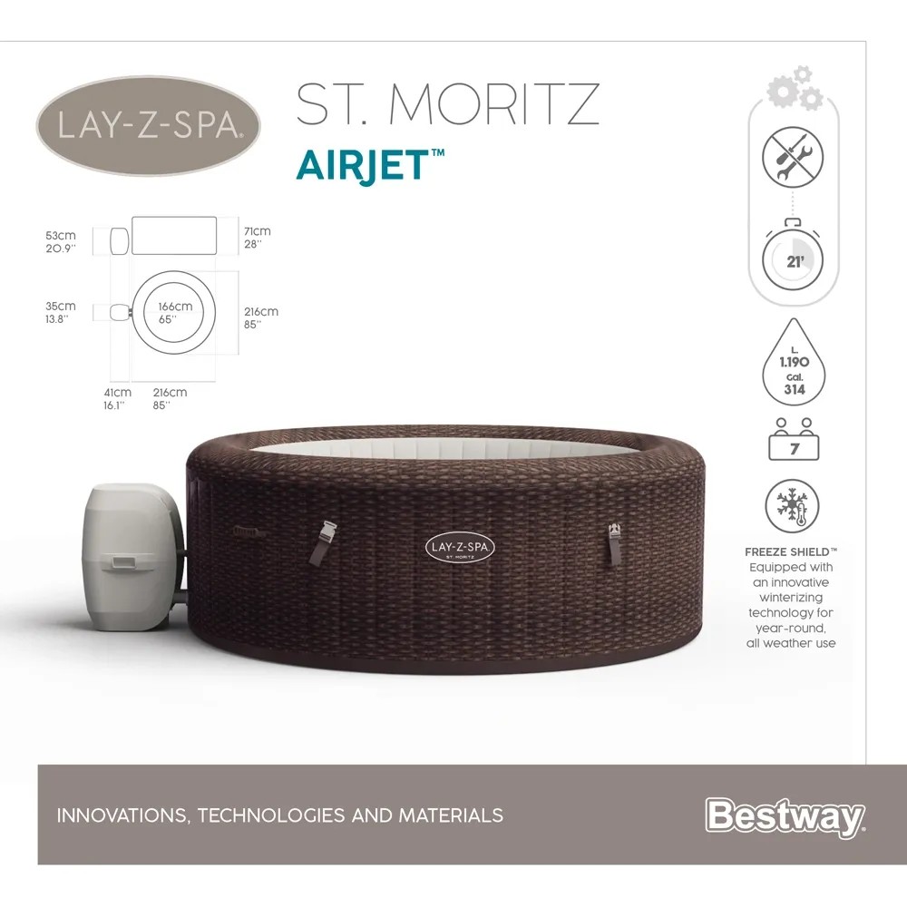 Wanna z hydromasażem St. Moritz AirJet™ to eleganckie, przestronne spa ogrodowe, które zapewnia relaks i odprężenie dla 5-7 osób. Dzięki dużym wymiarom - 216 cm średnicy i 71 cm wysokości - oraz pojemności 1190 litrów, jest idealnym wyborem dla większych rodzin lub grupy przyjaciół. Jego brązowy, rattanowy design doskonale komponuje się z naturalnym otoczeniem ogrodu lub tarasu. Spa osiąga temperaturę do 40°C zapewniając prawdziwy komfort.