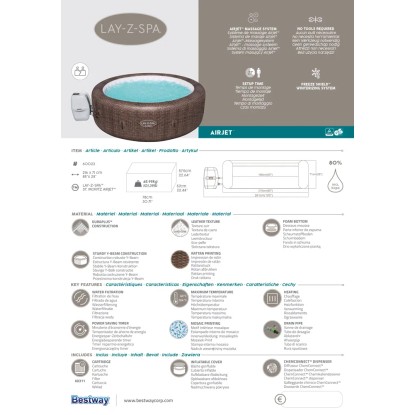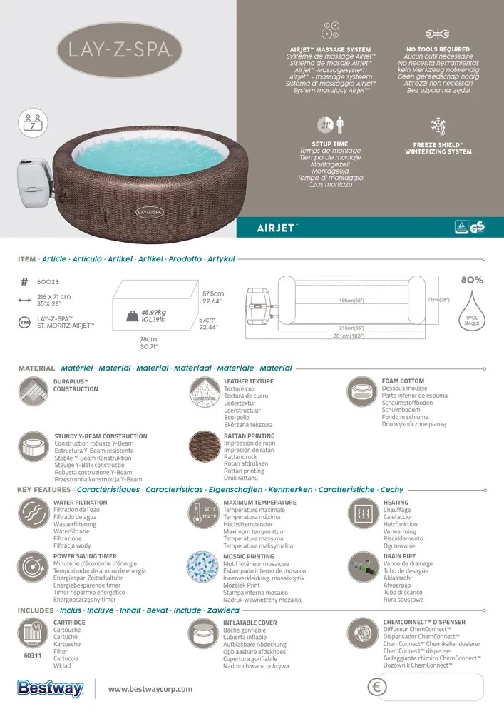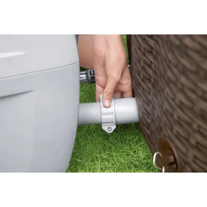 Spa ogrodowe St. Moritz wyposażone jest we wszystkie niezbędne elementy, aby korzystać z niego od razu po instalacji. W zestawie znajduje się termoizolacyjna pokrywa z klipsami, która pomaga utrzymać temperaturę wody i chroni przed zabrudzeniami, dozownik ChemConnect™ równomiernie rozprowadzający chlor, wkład filtra (typ VI) odpowiadający za czystość wody oraz łatka naprawcza przydatna przy drobnych uszkodzeniach.
