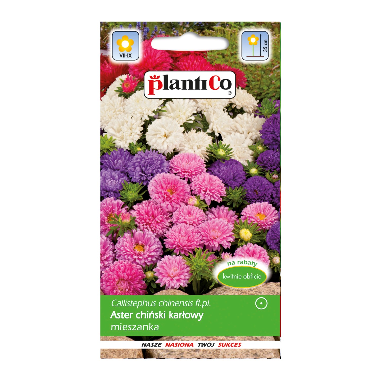 Aster chiński karłowy - mieszanka kolorów. Rośliny wyróżniają się zwartym pokrojem i niskim wzrostem 30-40 cm.