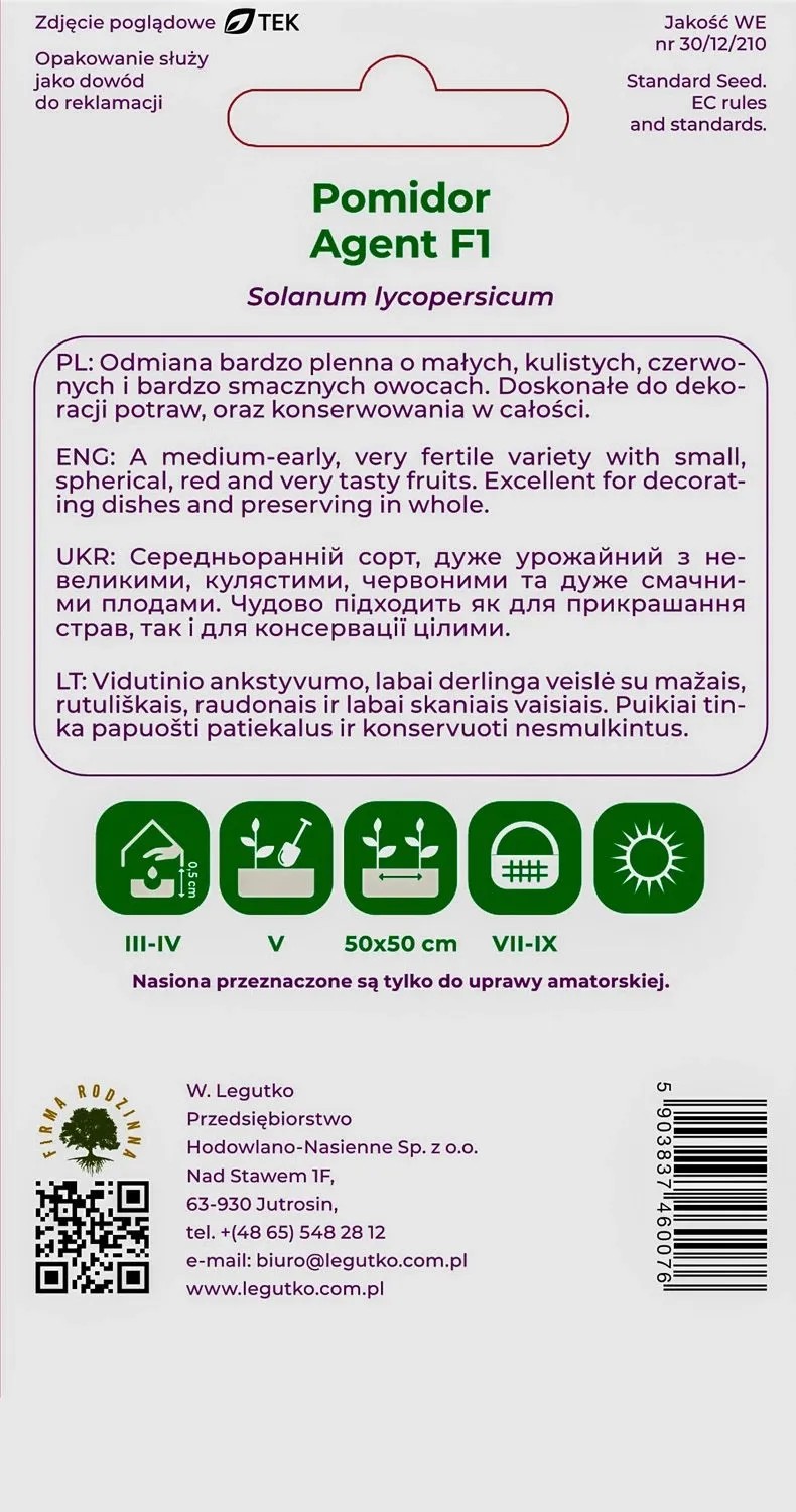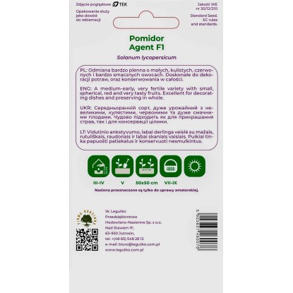 Pomidor gruntowy tyczny Agent to odmiana bardzo plenna o małych, kulistych, czerwonych i bardzo smacznych owocach. Doskonałe do deko racji potraw, oraz konserwowania w całości.